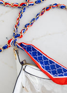 Elevate your bag or phone with the Chain Scarf Strap, a bold accessory that blends fashion and function. Featuring a gold chain interwoven with luxe patterned fabric, this versatile strap adds a touch of gameday glam to any crossbody bag or phone case. Perfect for the stadium, tailgate, or brunch with your girls — it’s the ultimate way to show team spirit while keeping your look chic and elevated.