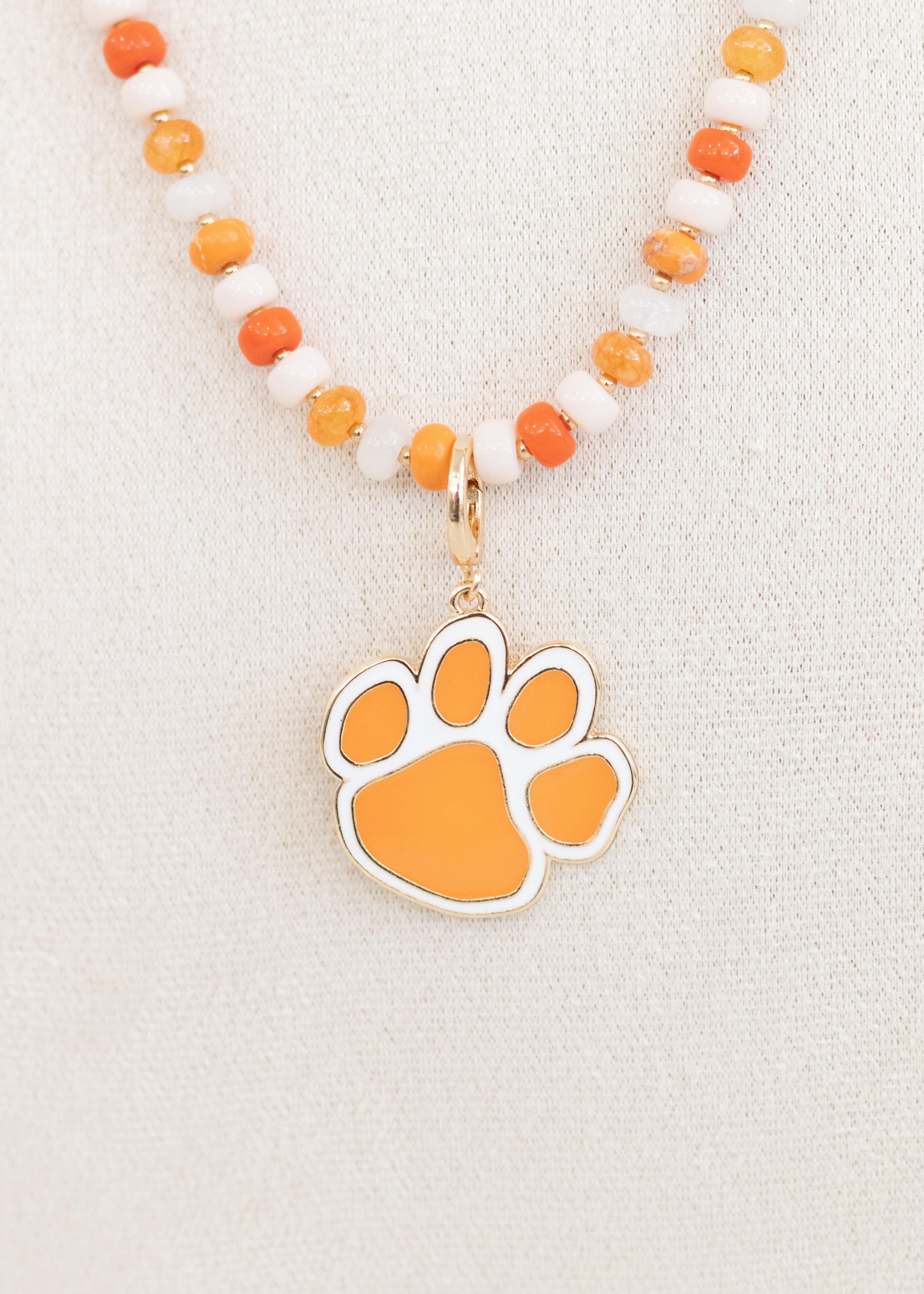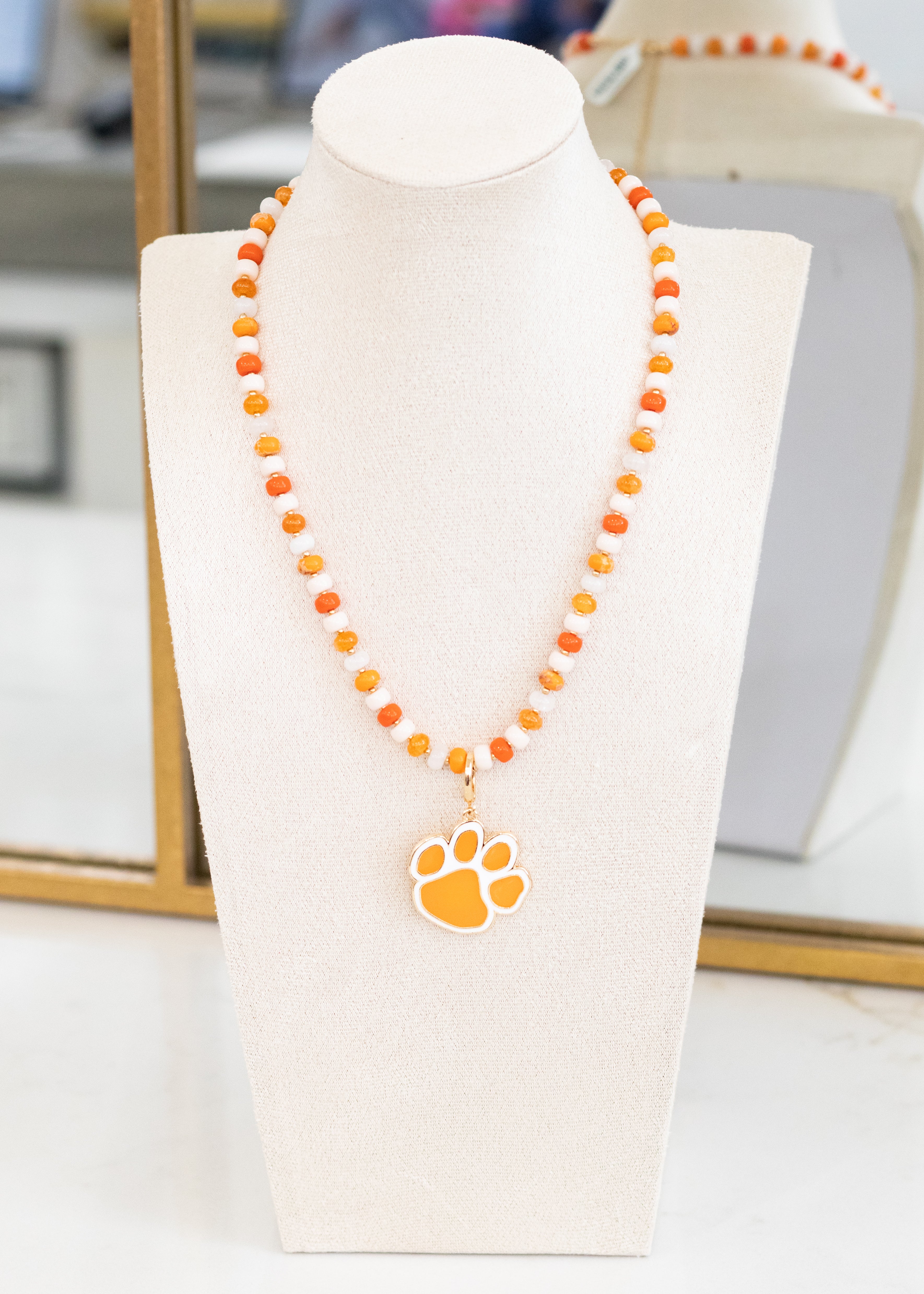 Bring the spirit and the style 🧡🐾 Our Orange Beaded Necklace featuring an Orange Paw Pendant is the perfect accessory for game days and tailgates. Hand-strung with glossy orange beads, this necklace pops with school pride, while the matching enamel paw charm adds a fun, spirited touch. Whether you’re cheering from the stands or styling it for everyday wear, it’s a must-have for true fans.