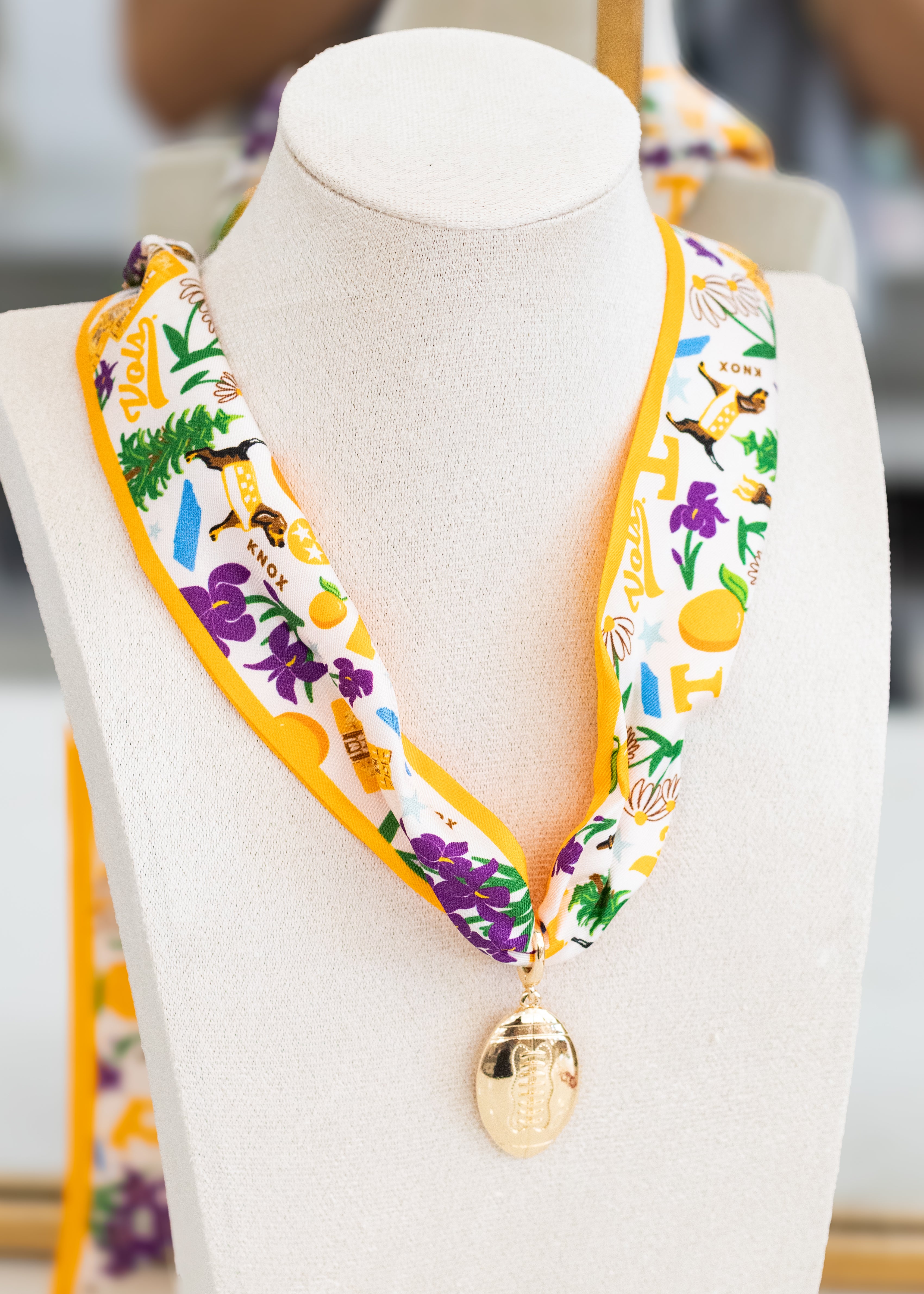 Go Vols! 🧡🏈 Our Tennessee Scarf with Gold Football Pendant is the cutest way to show your team spirit. The silky orange-and-white design pops with school colors, while the gold football charm adds a touch of glam. Whether you’re cheering in Neyland or styling it for everyday wear, this scarf is a total win.