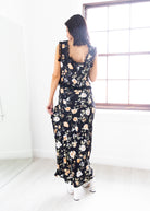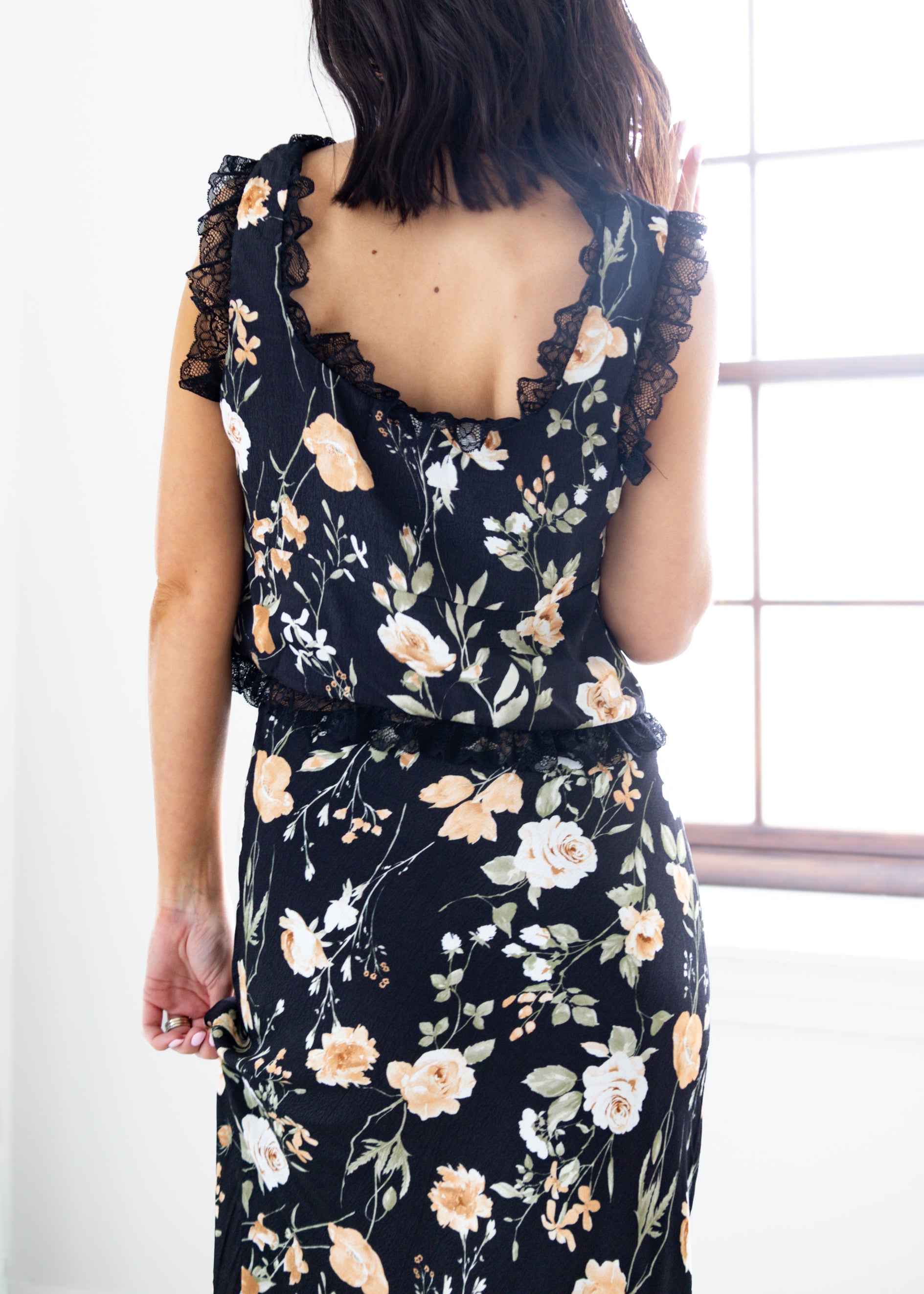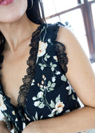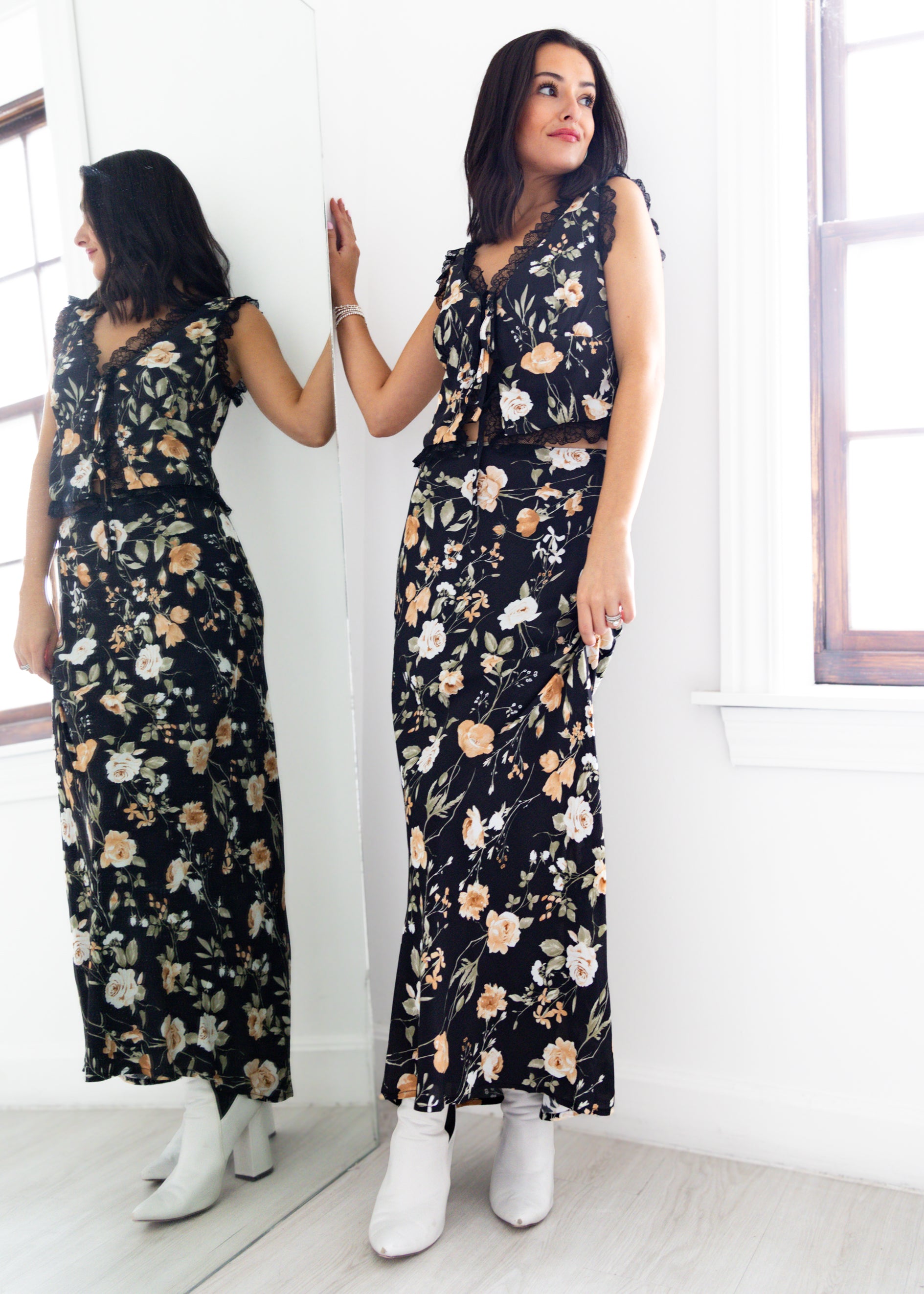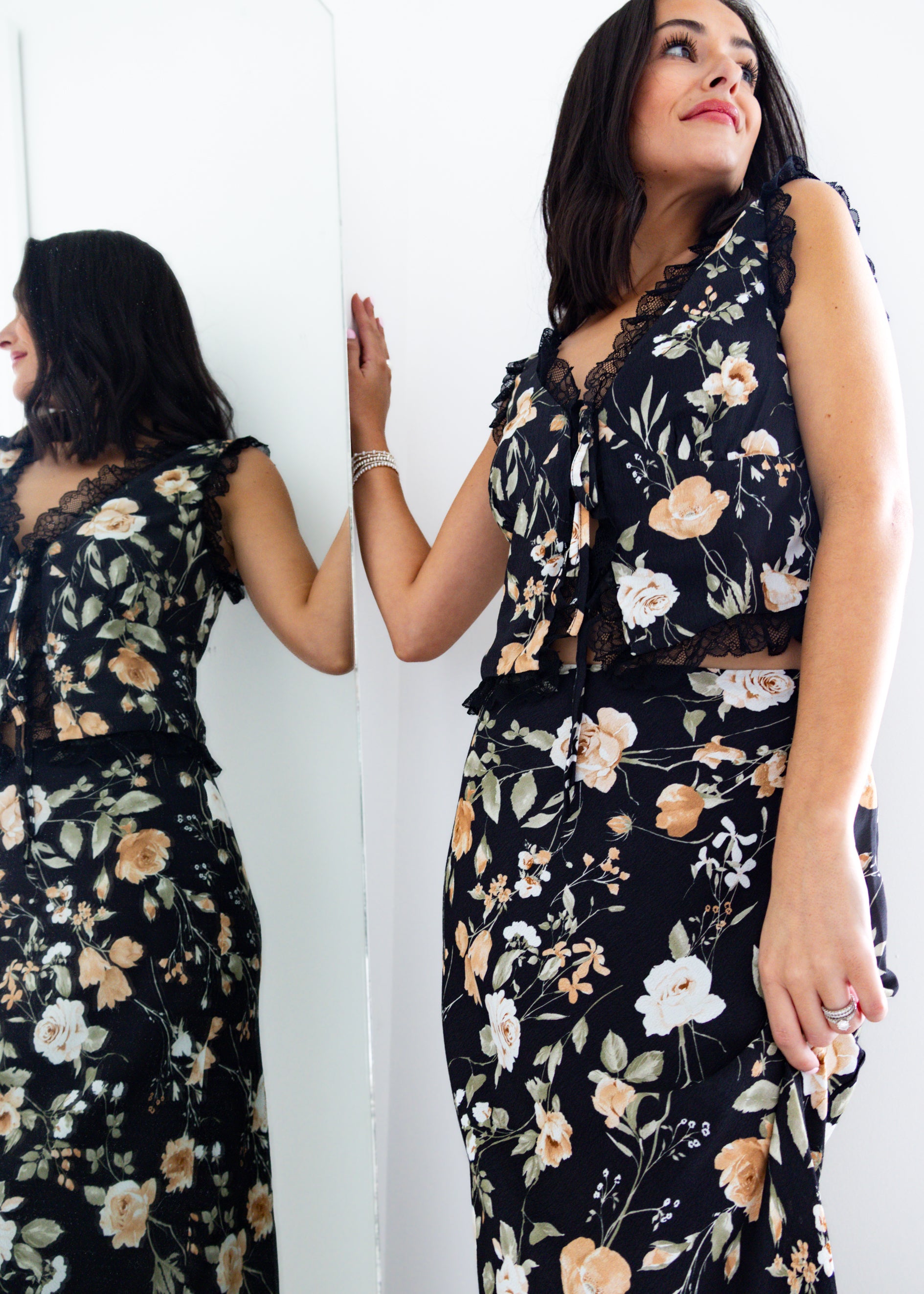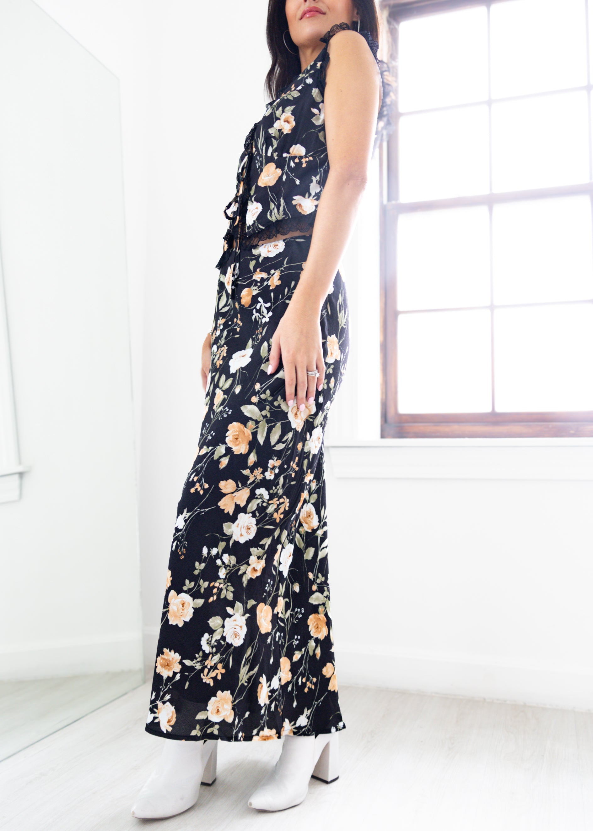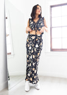 Romantic and effortlessly chic, this floral two-piece Ava Black Floral Set is made for every occasion. The sleeveless top features a plunging V-neckline with delicate lace trim and tie-front detail, adding a touch of feminine charm. Paired with the flowy maxi skirt in a matching floral print, this set offers an elegant silhouette that moves beautifully with you. Perfect for garden parties, brunch dates, or evening getaways, this floral set brings timeless style with a modern twist.