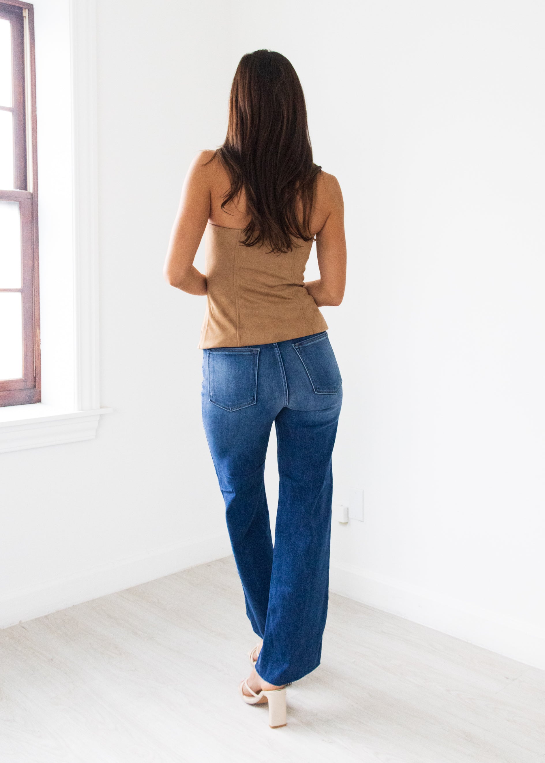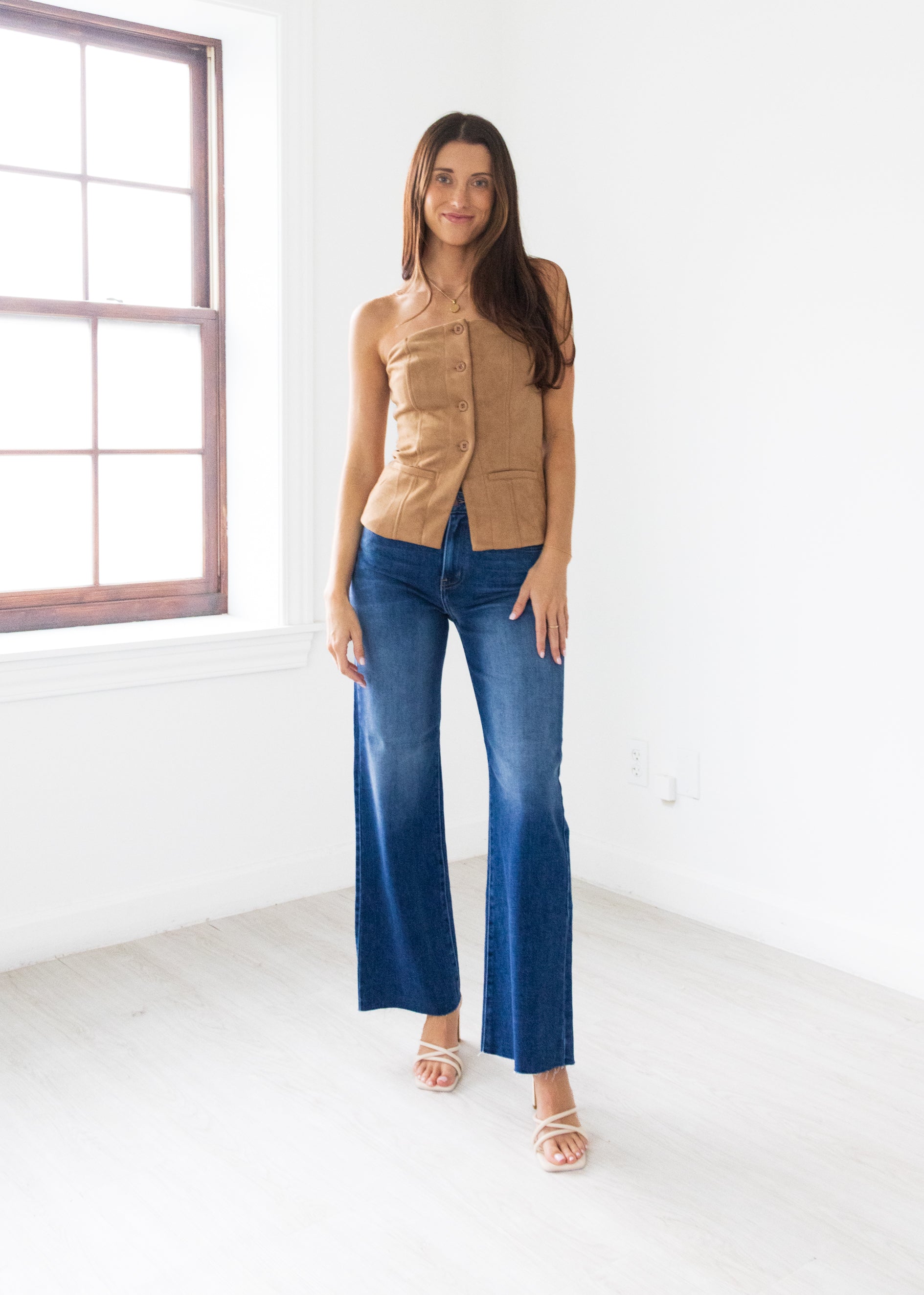Elevate your style with the Camdyn Suede Top, a sleek camel-colored strapless design that combines sophistication and edge. Featuring a smooth suede texture and buttons running down the front, this top offers a versatile look perfect for dressing up or down!