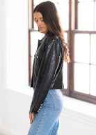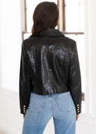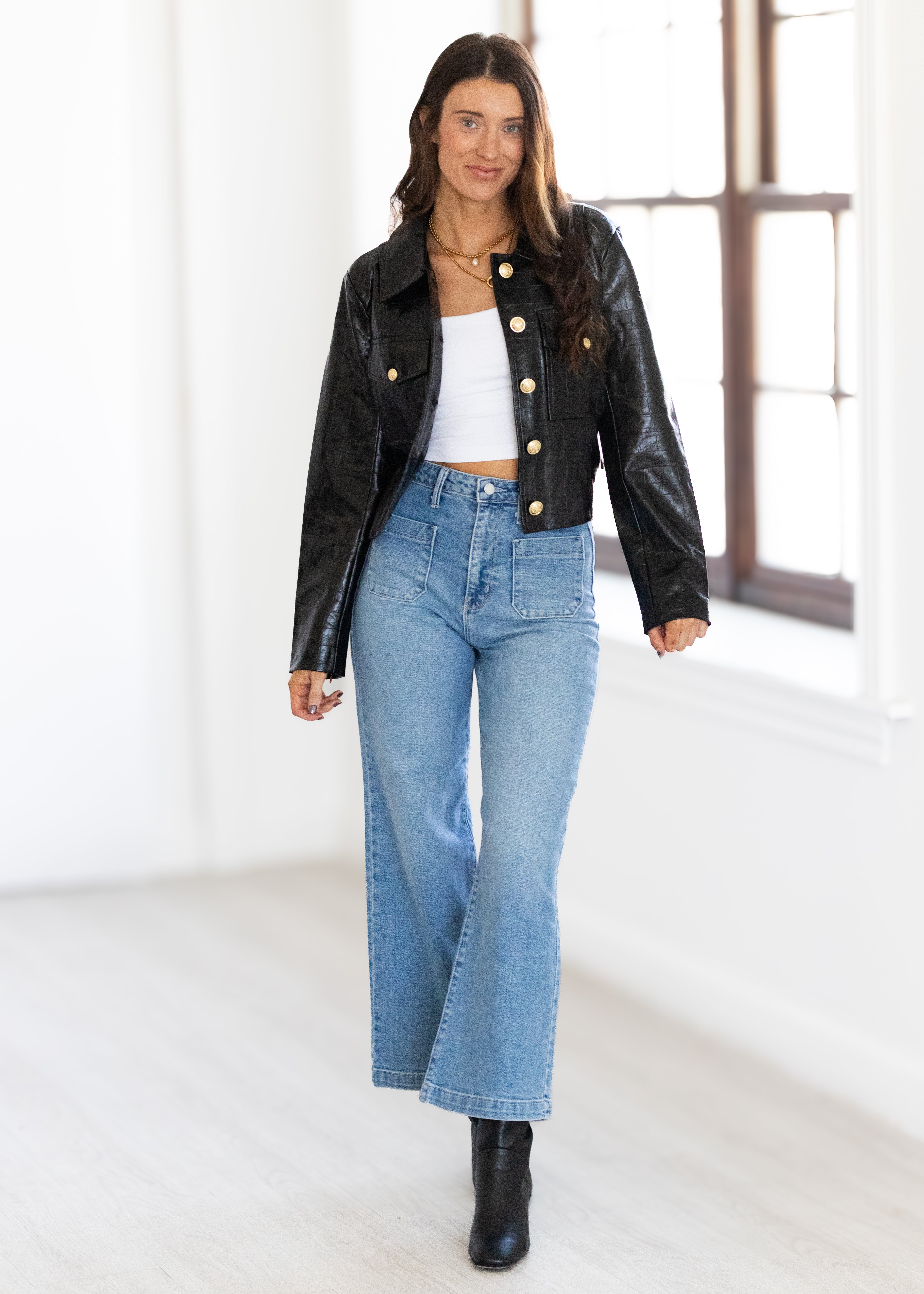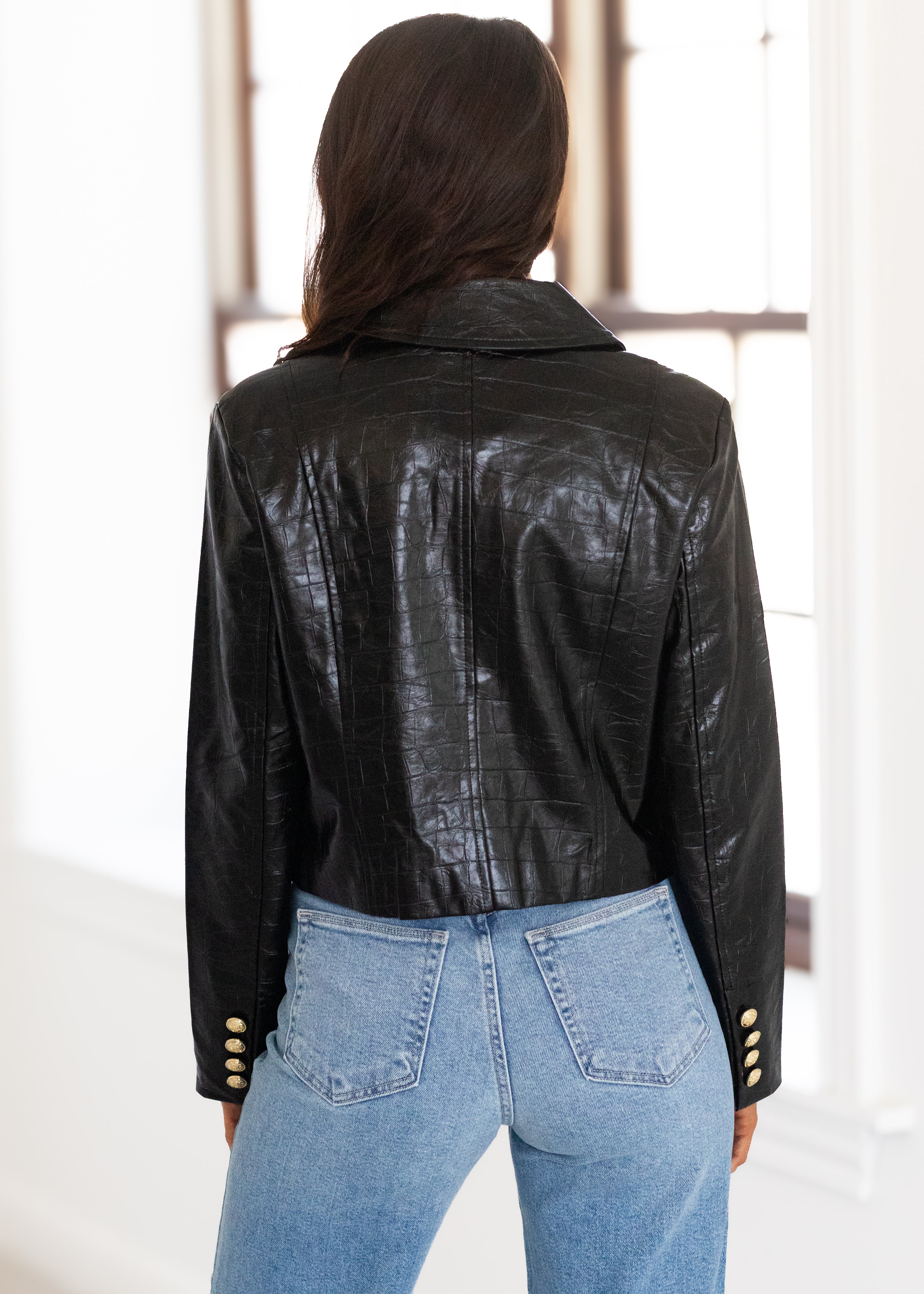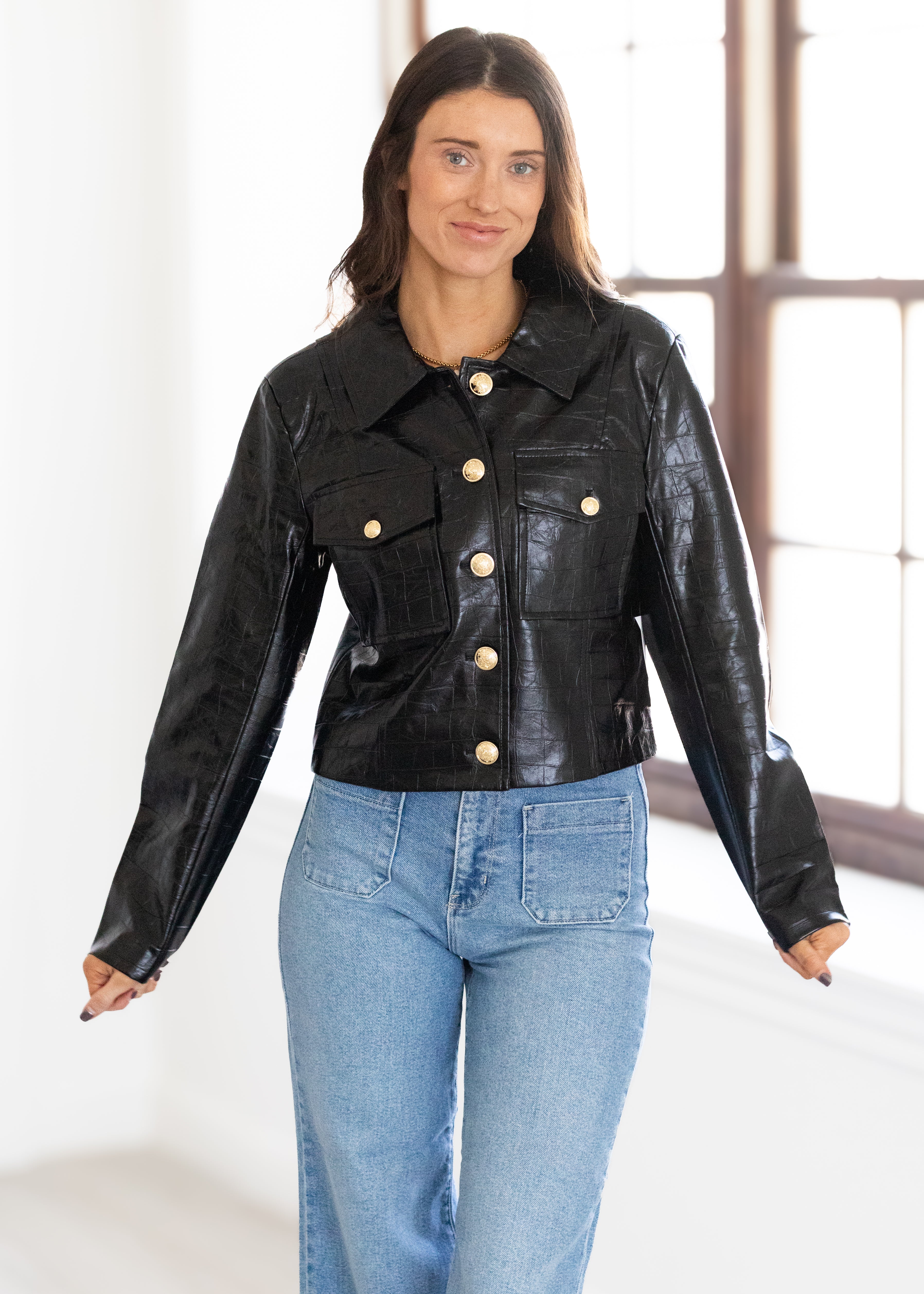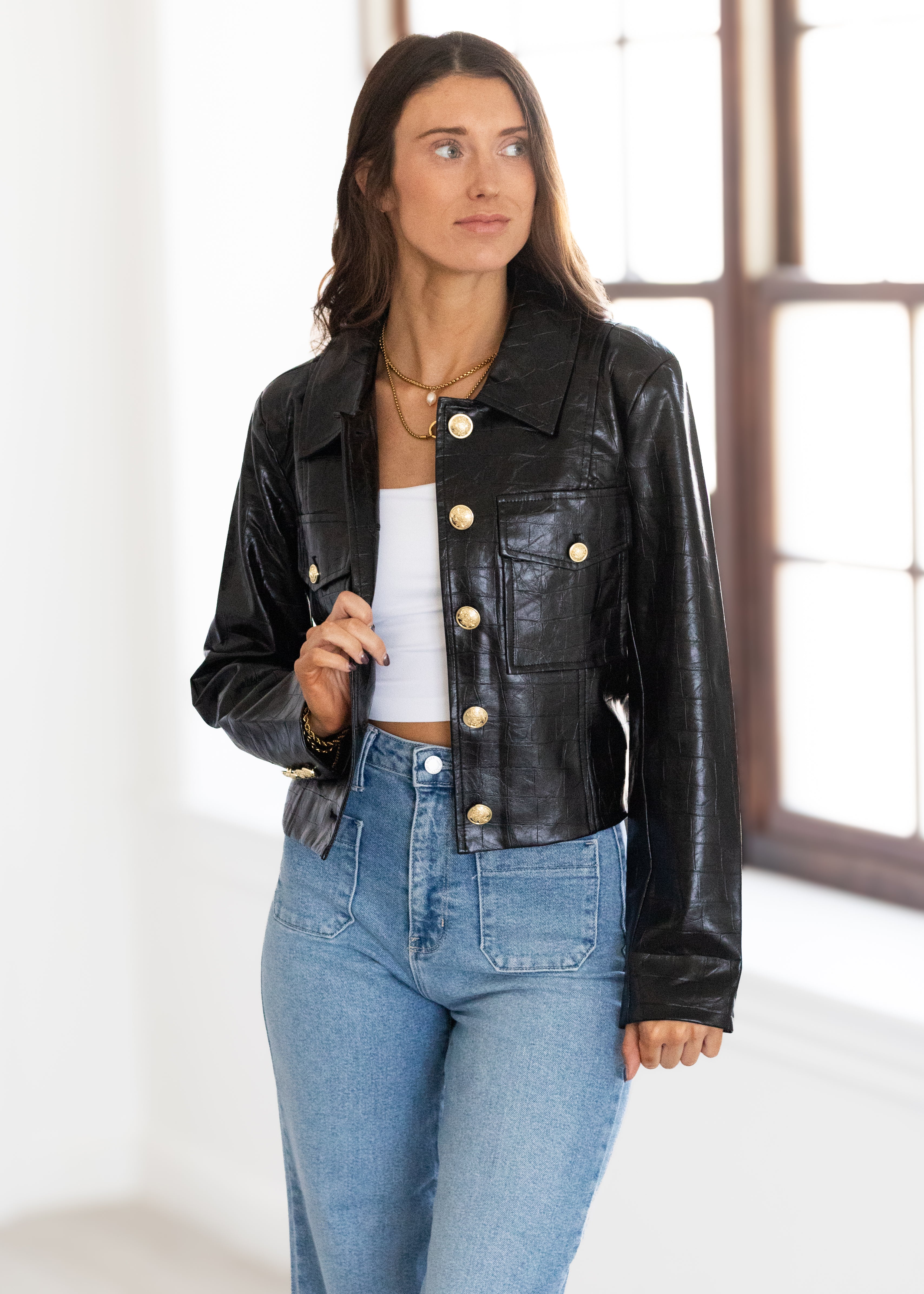 Turn heads this fall in our luxe black croc-embossed faux leather jacket, detailed with luxe gold buttons and functional flap pockets. The sleek, cropped silhouette adds a modern edge to any outfit, making it the perfect layering piece for women’s fall fashion. Style it with high-waisted trousers, skirts, or dresses for an effortlessly sophisticated look.