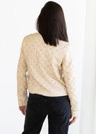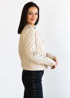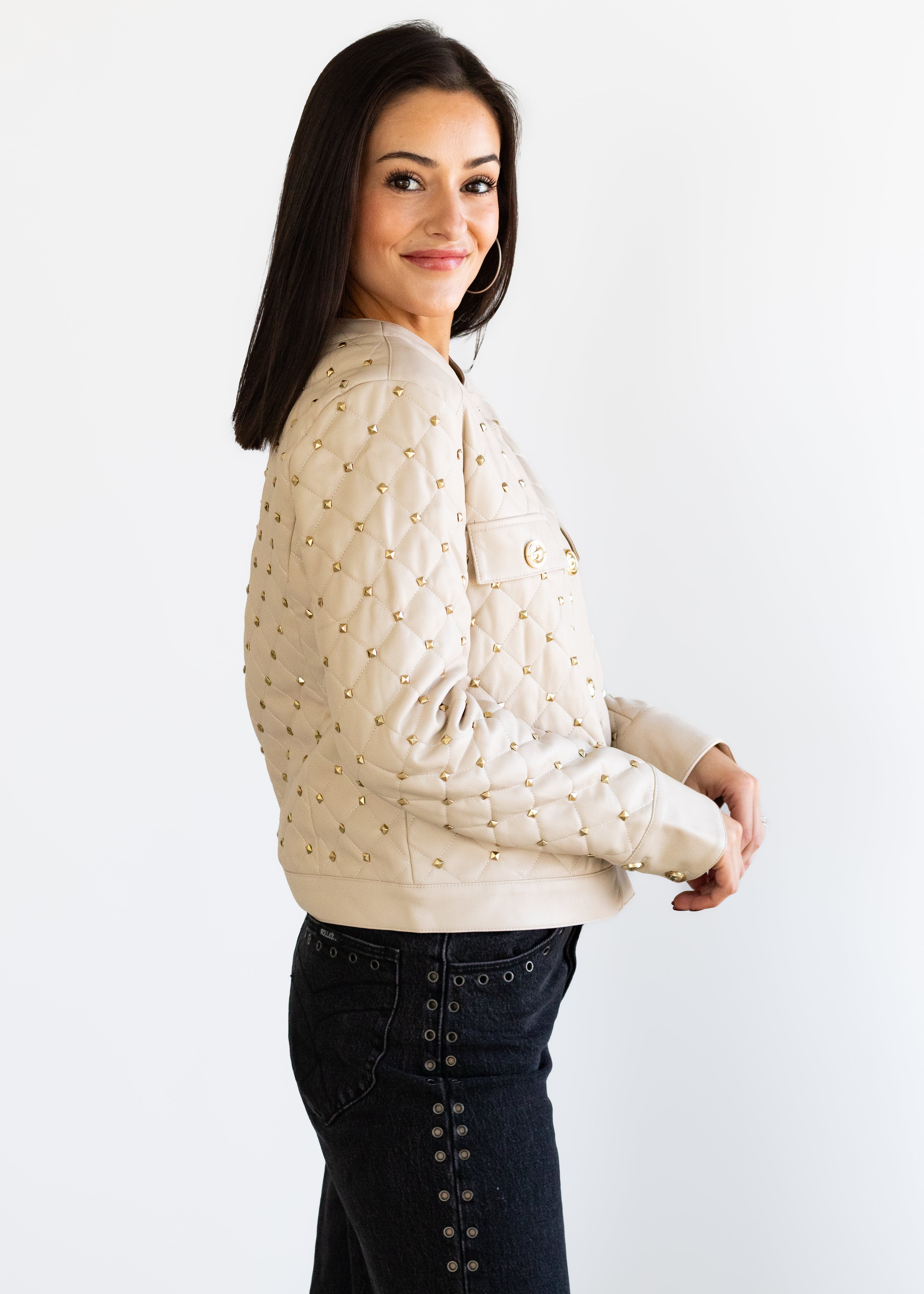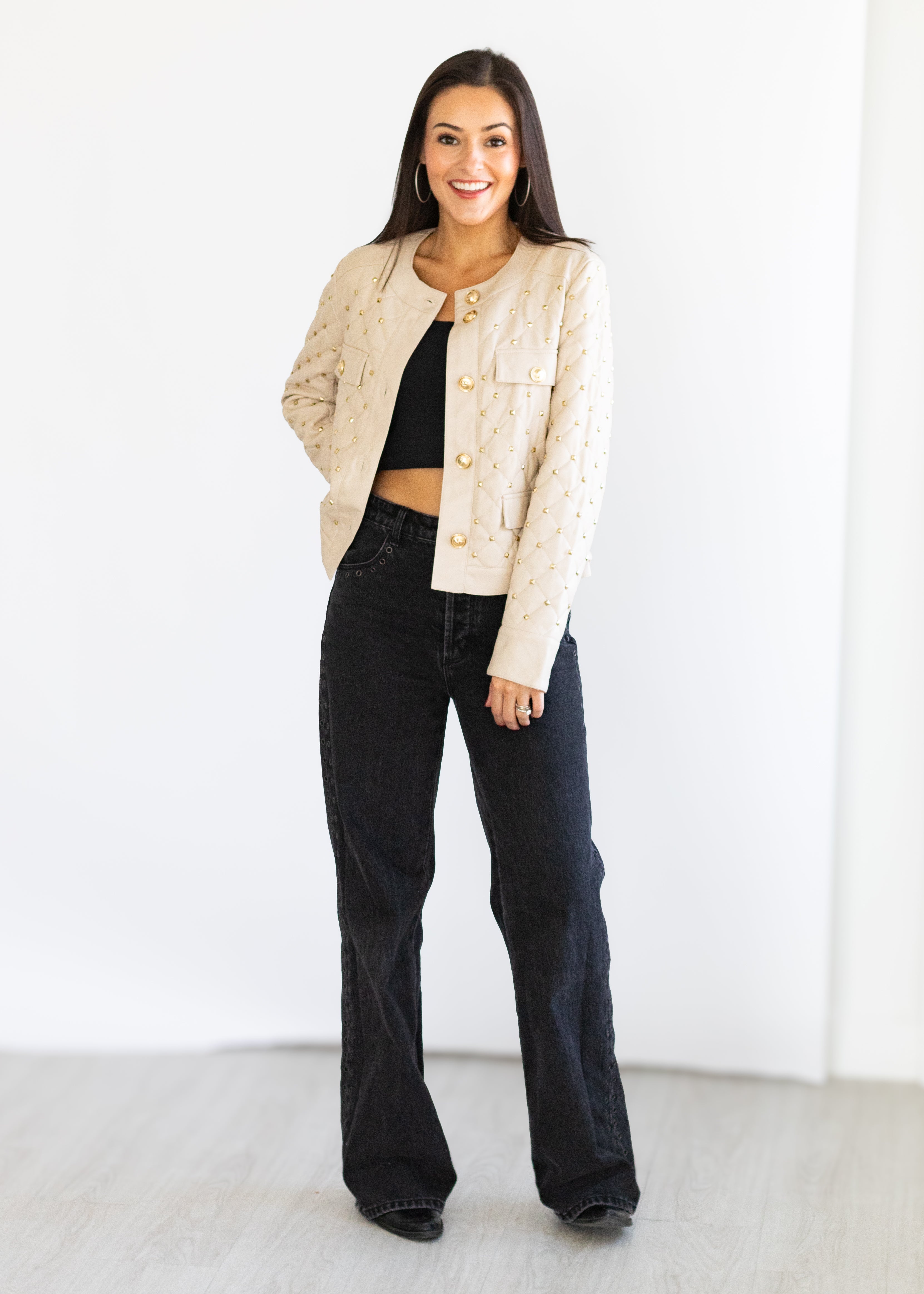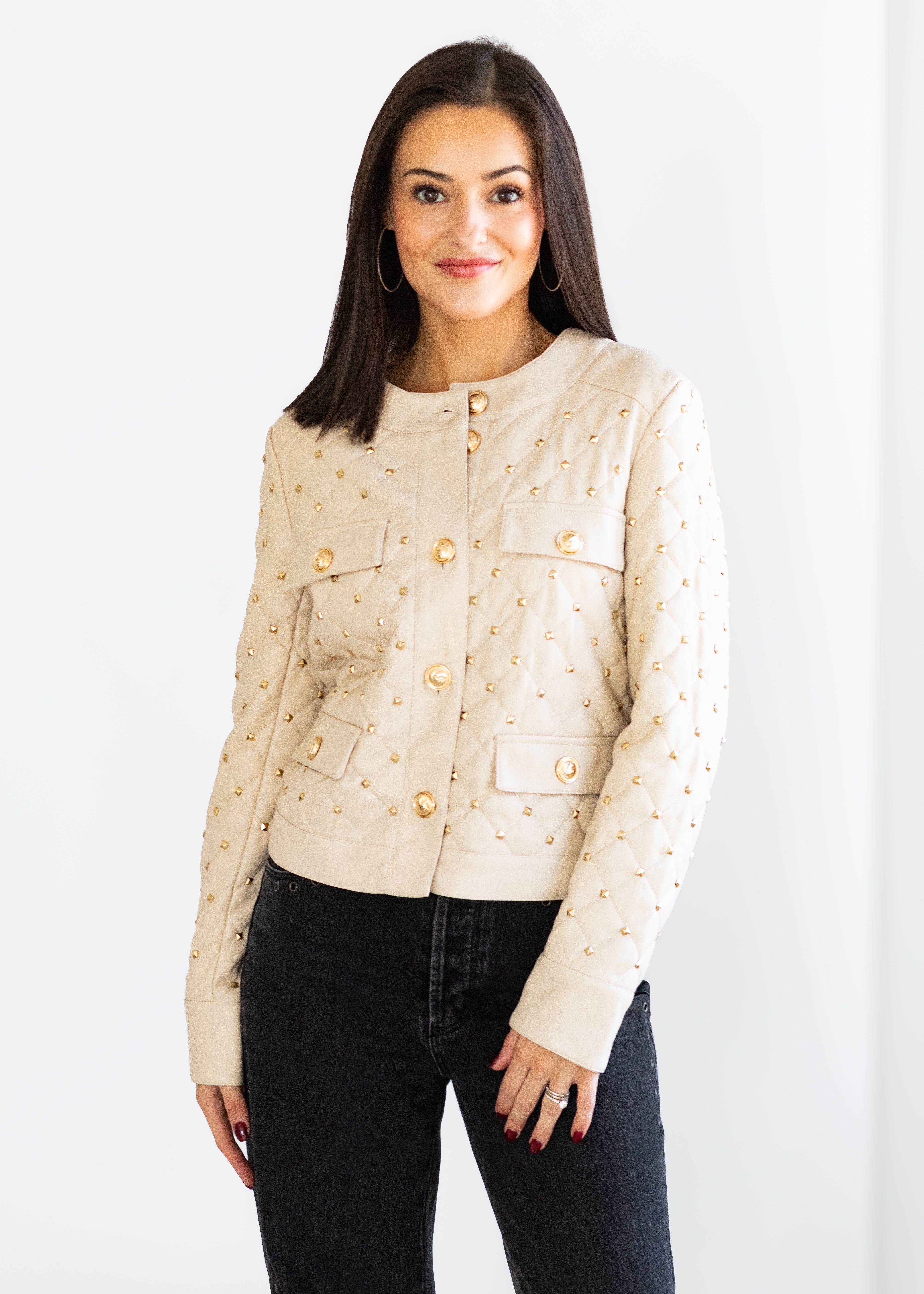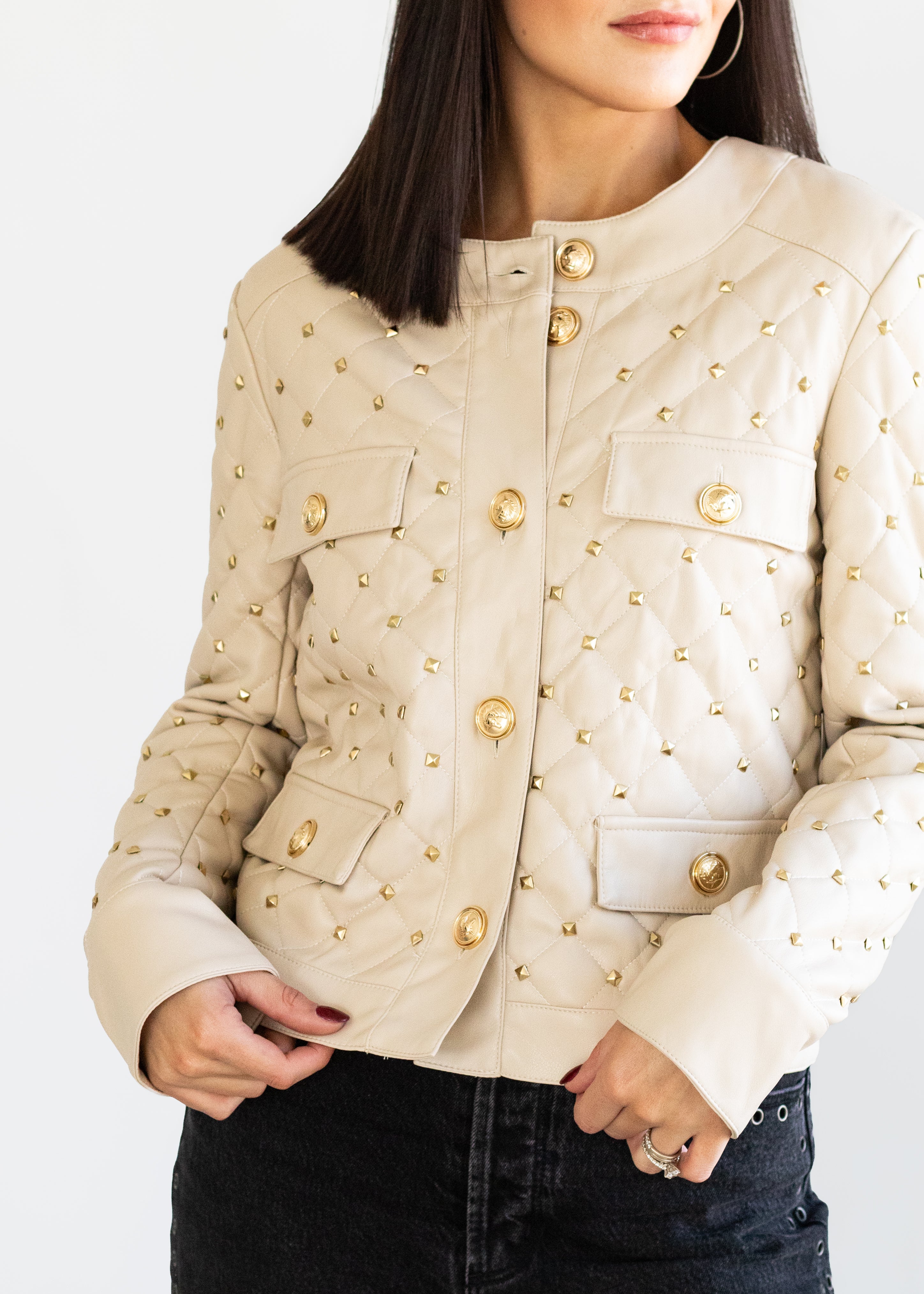 Elevate your fall style with our beige quilted faux leather jacket, featuring gold-tone stud details, statement buttons, and front flap pockets. The classic round neckline and chic design bring timeless sophistication to women’s fall fashion. Perfect for pairing with tailored pants, skirts, or dresses for a polished, luxurious look.