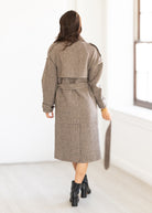 Timeless sophistication meets modern tailoring in this wool blend trench coat. Crafted from a heavyweight, non-stretch felt fabric, it features a notched collar, long sleeves, and a double-breasted silhouette with button placket. The contrast fold-over lapel and front welt pocket add elevated detail, while the self-tie belt cinches the waist for a flattering fit. A statement outerwear piece that brings warmth and polish to every fall and winter look.