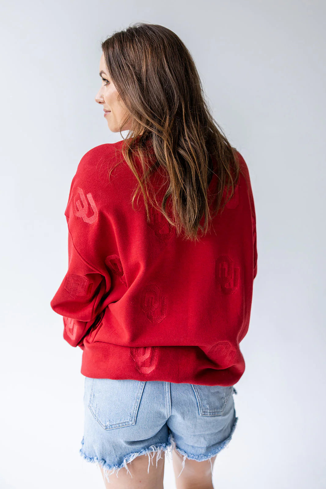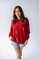 Show your school pride in the Oklahoma Ritter Repeat Lantern Sleeve Crew — a crimson crewneck updated with feminine lantern sleeves and embroidered repeat detail for a polished gameday look. Made with a cozy 60% cotton / 40% polyester blend and designed with a slightly-oversized fit, this embroidered crew layers perfectly for tailgates or weekend wear.