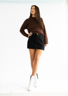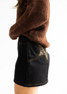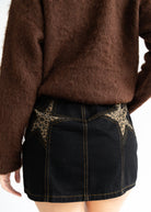 Turn heads in this dark wash denim mini skirt, designed with bold leopard star accents that pop on the back pockets. The flattering high-rise fit and trendy mini length make it a go-to piece for both casual days and nights out. Perfect for adding a touch of edgy flair, this denim skirt pairs effortlessly with graphic tees, crop tops, or a chic blouse. A must-have for any fashion-forward wardrobe, it brings fierce style and playful charm in one standout look.