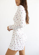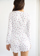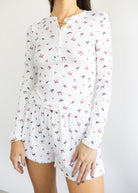 Get cozy in our Z Supply Luxe Holly PJ short Set — the sweetest addition to your winter wardrobe. This matching set features a soft ribbed knit fabric with a festive print of tiny red bows, holly leaves, and berries scattered across a crisp white base. The long-sleeve top includes a henley-style neckline with button details, while the relaxed-fit shorts have a stretchy waistband and delicate lettuce-edge hems for a flirty, feminine touch.