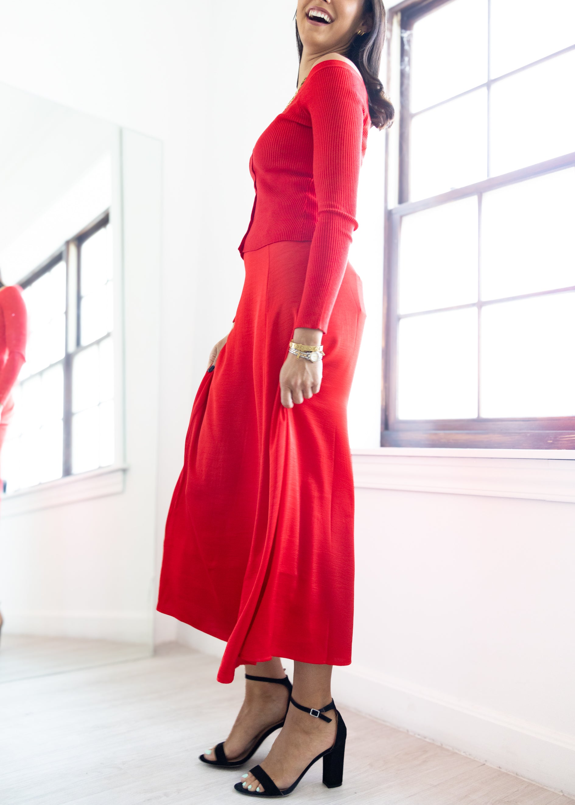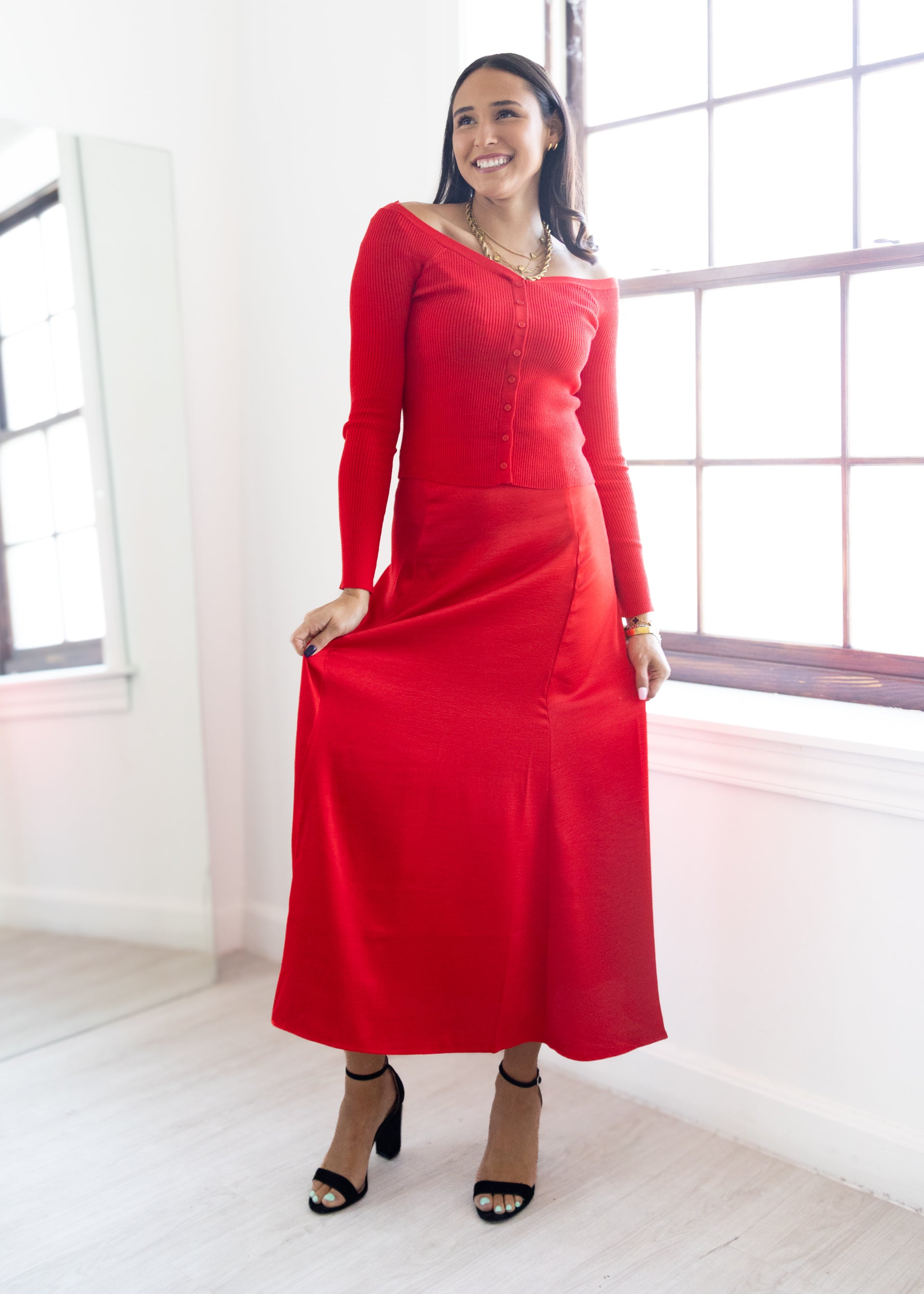 Add a festive touch to your wardrobe with the Z Supply Northpointe Midi Skirt – Red. This sleek, high-rise skirt features a smooth satin finish and an invisible zip closure for a clean, polished look. Its flattering midi length makes it perfect for holiday parties, date nights, or seasonal events. Effortlessly chic and versatile, it’s the statement piece your winter wardrobe needs.