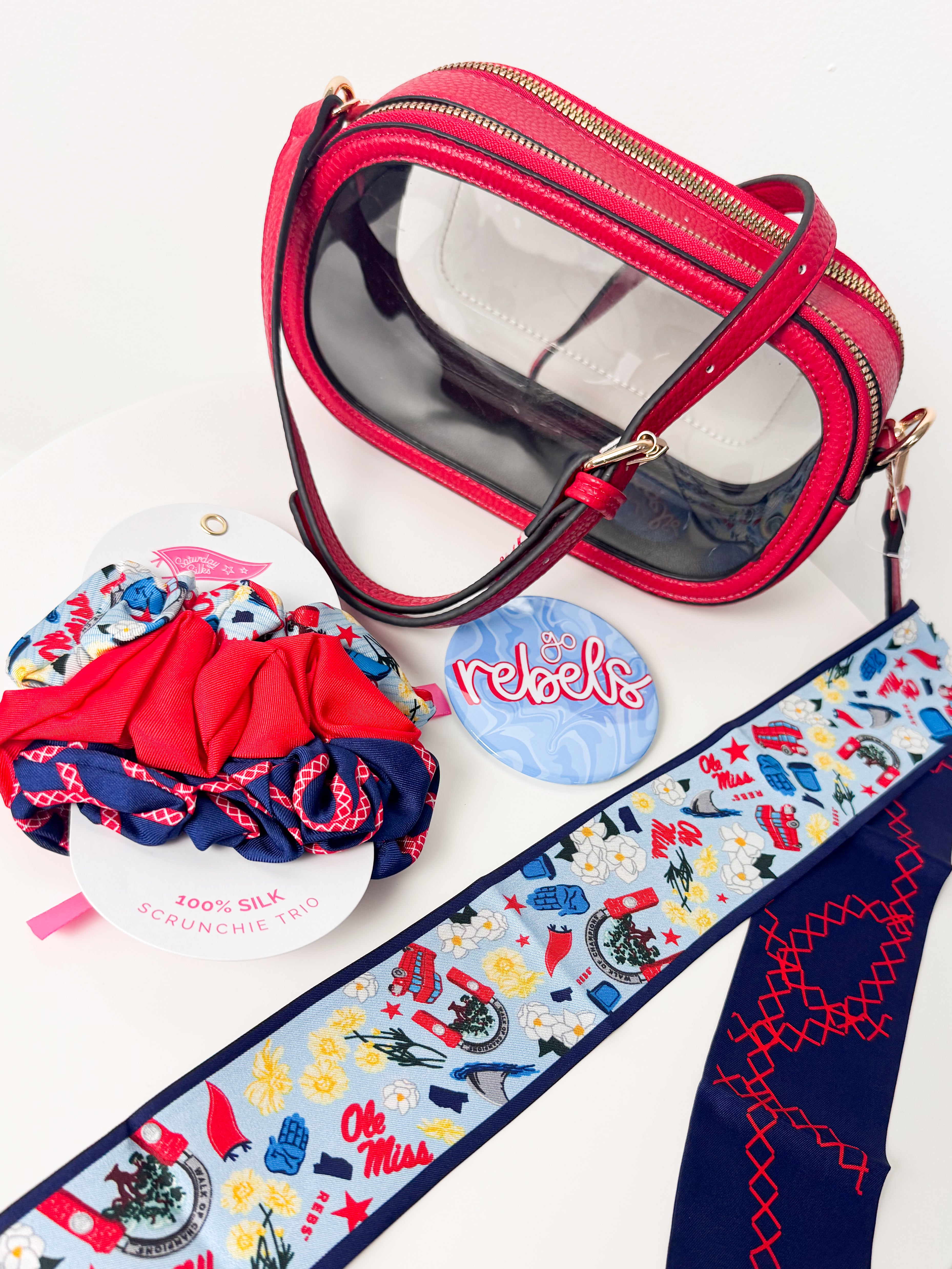 Hotty Toddy! This all-in-one gameday bundle has everything you need to show your Ole Miss pride in style. The silky Ole Miss Twilly Scarf, stadium-approved Red Oval Clear Crossbody, festive Rebels gameday button, and matching Ole Miss scrunchie set make it easy to accessorize from head to toe. Cute, spirited, and stadium ready—just add your outfit and you’re Rebel gameday perfect!