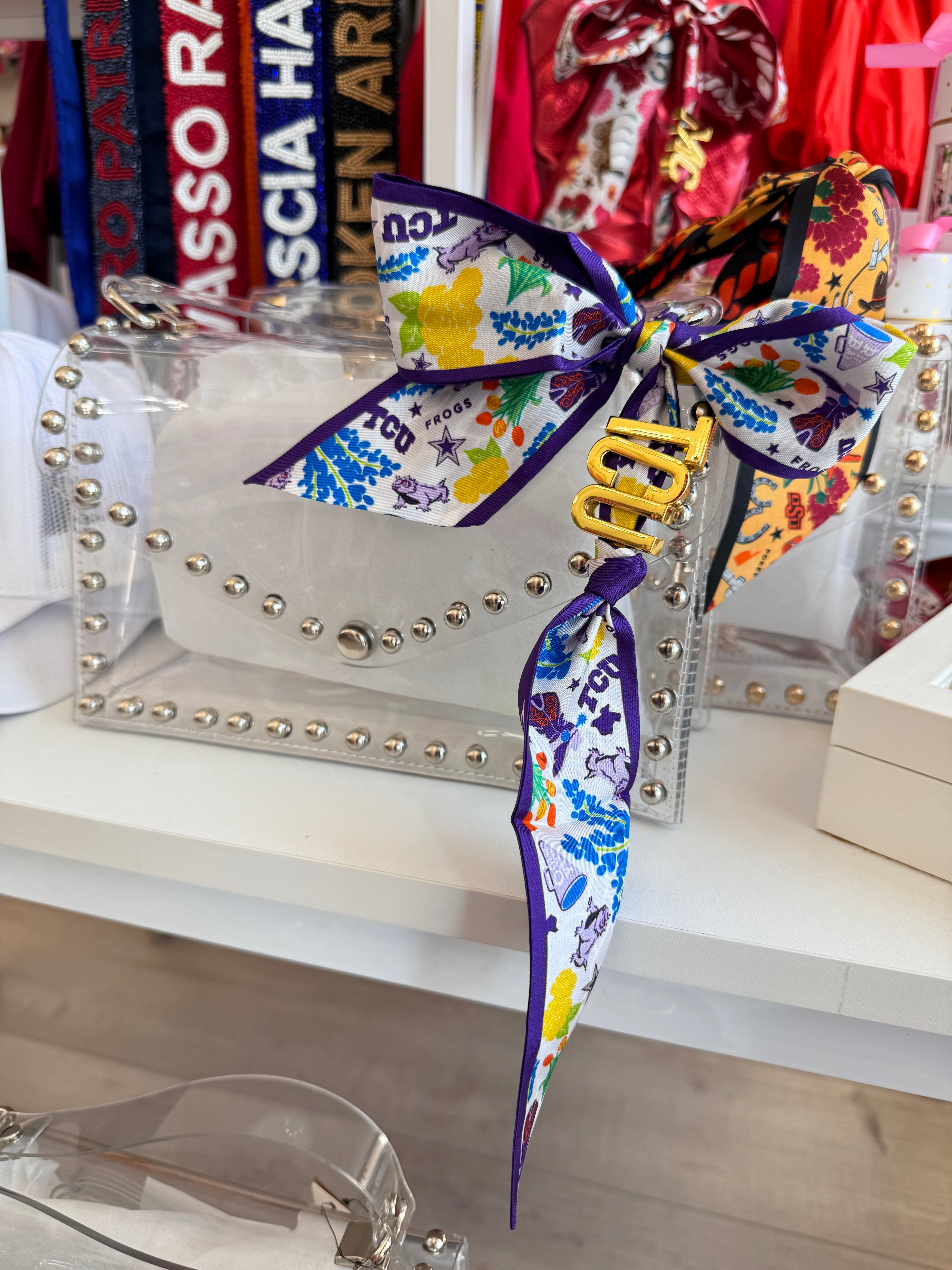 Add a splash of school spirit to your look with our TCU Twilly Scarves featuring shiny gold "TCU" initial sliders. Perfect for showing off your Horned Frogs pride, these scarves add a fun and stylish flair to any outfit.