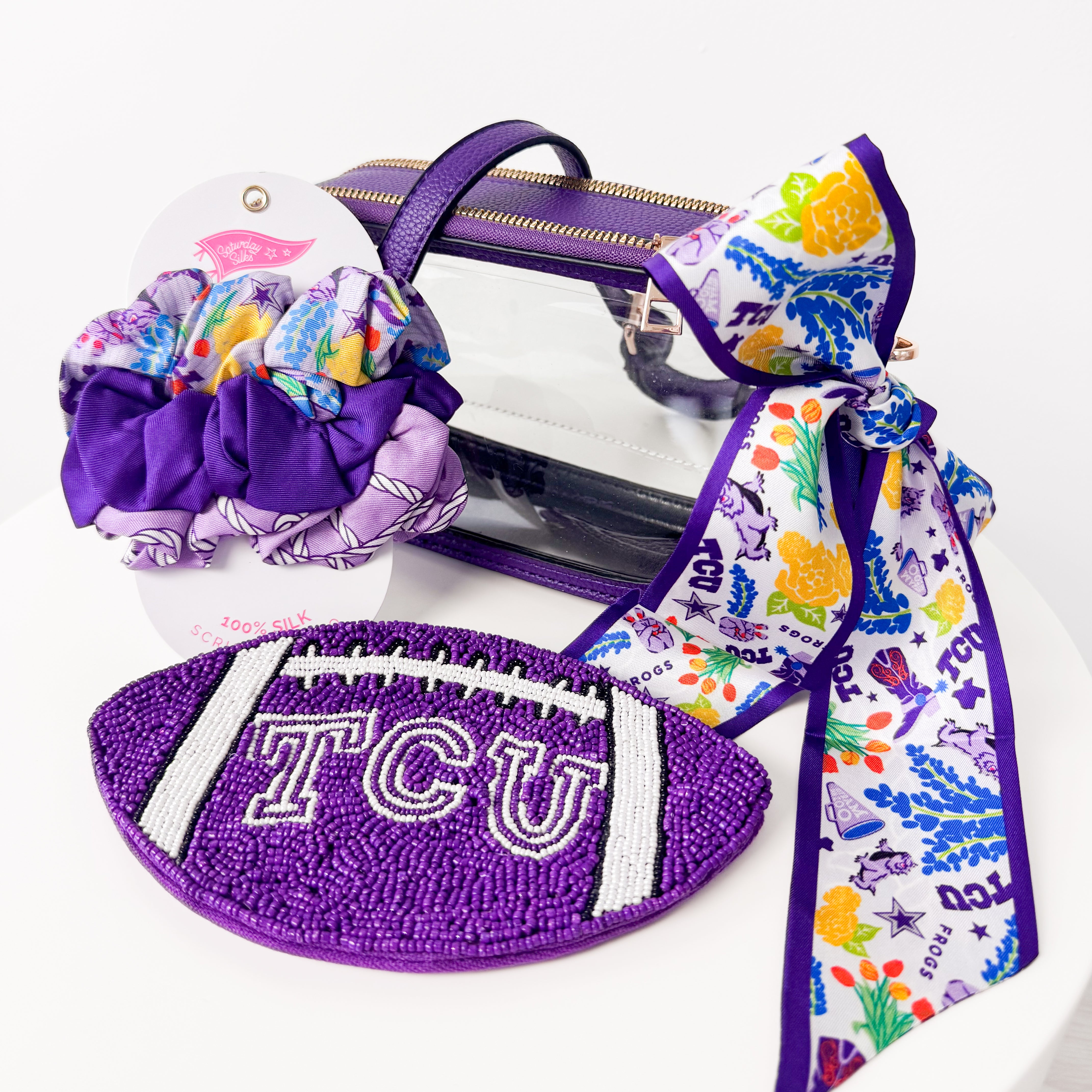 Cheer on the Horned Frogs from head to toe with this all-in-one gameday set! The silky TCU Twilly Scarf, stadium-approved purple clear crossbody bag, festive TCU beaded coin purse, and matching TCU scrunchie set make it easy to show your school pride in style. Cute, coordinated, and stadium ready—this bundle has everything you need for a perfect gameday look!