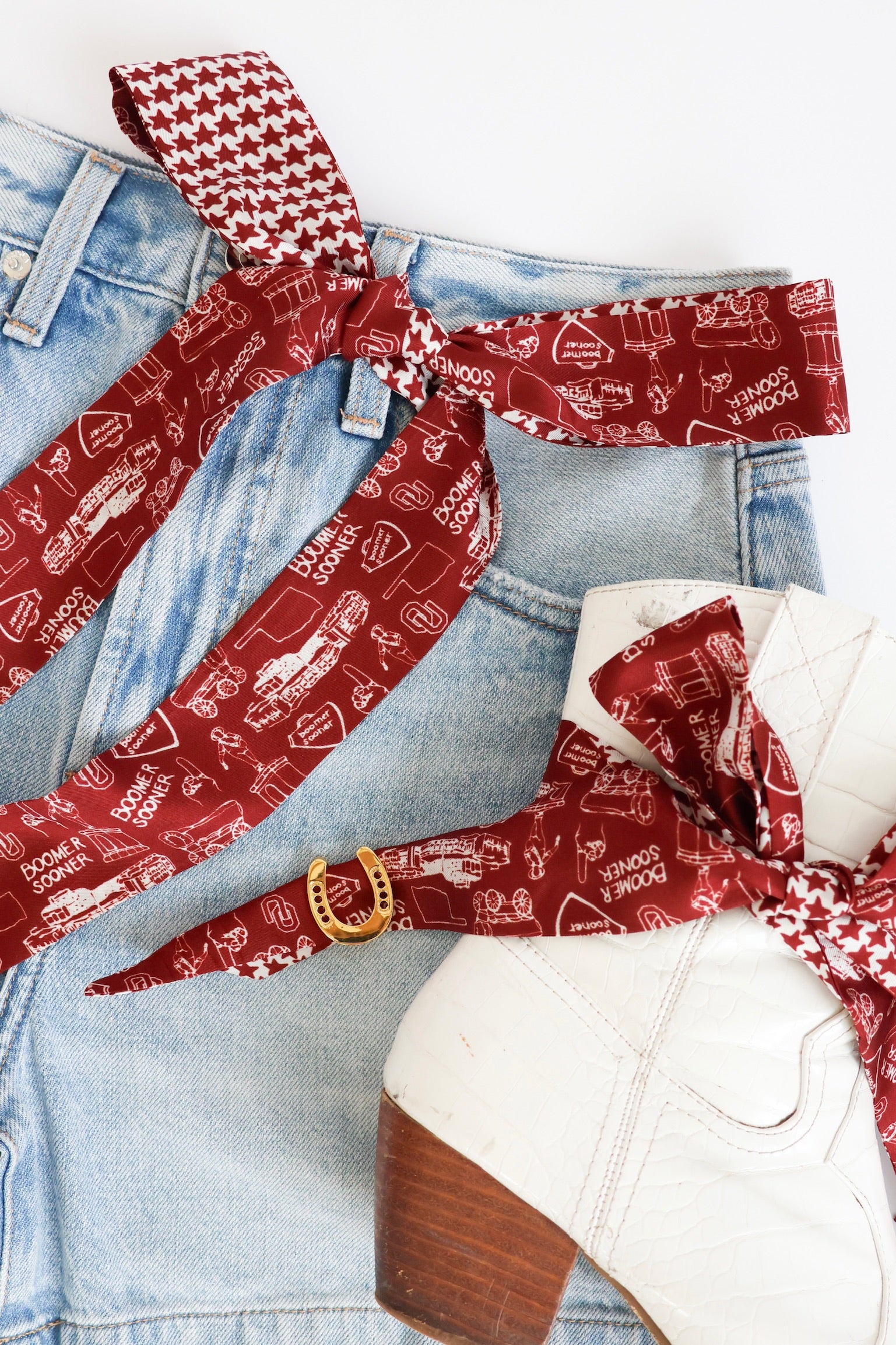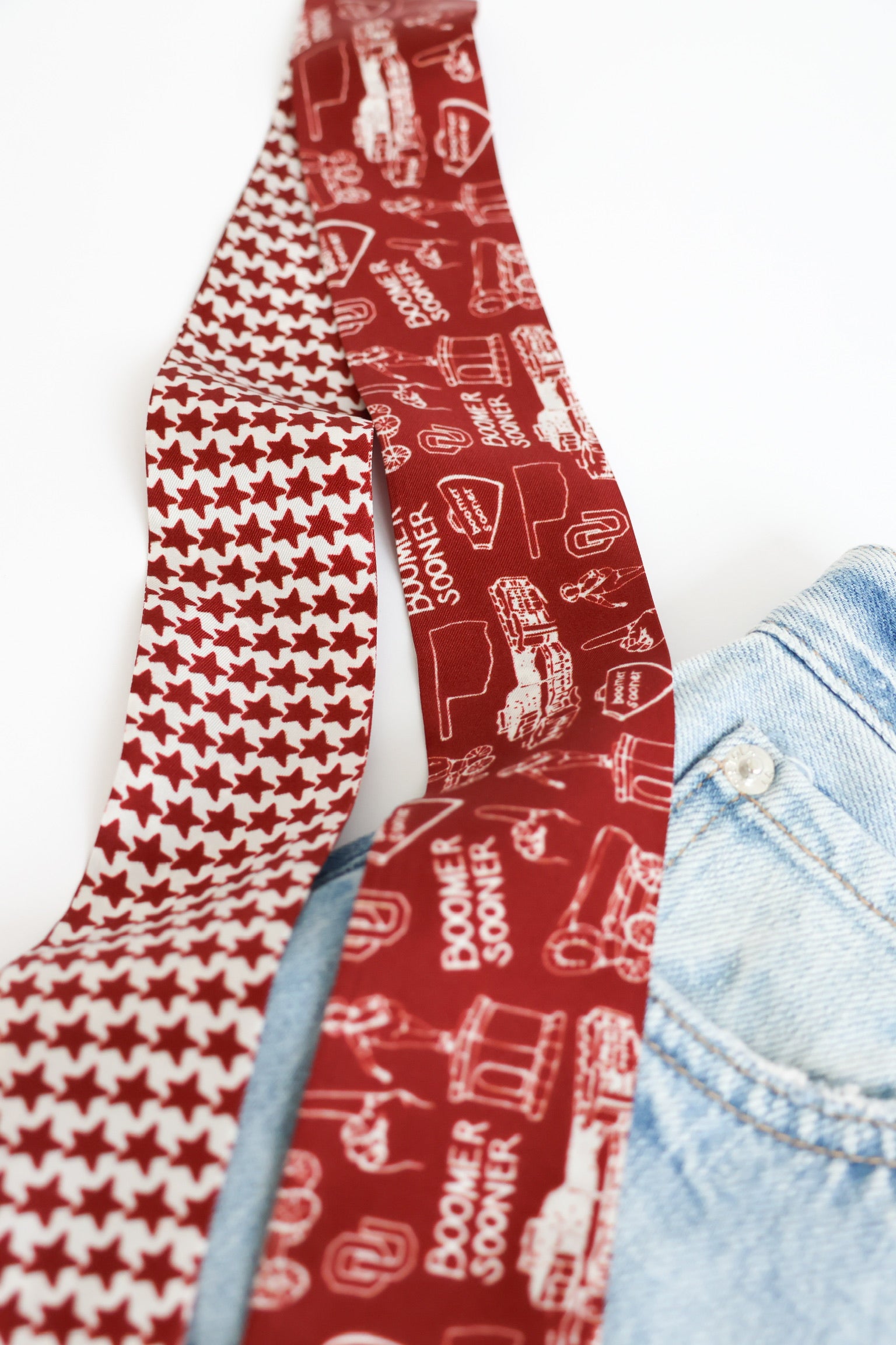 Crafted from premium silk, this scarf is lightweight, smooth to the touch, and exudes sophistication. Its versatile design allows it to be styled in multiple ways—wrap it around your neck, tie it to your handbag, or weave it through your hair for a chic touch. Flaunt your Sooner spirit with this eye-popping Oklahoma design that screams team pride! Whether you're rocking jeans at the tailgate or dressing up for an event, this fun scarf adds that perfect crimson-and-cream pop to any outfit. Game day or any day—show off your OU love in style!