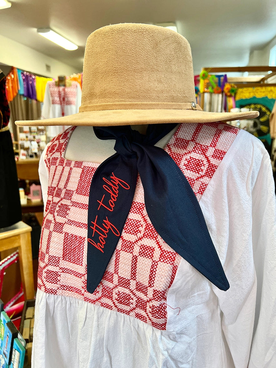 Add a bold pop of color and timeless charm with this navy blue ascot scarf, featuring elegant red embroidered text for that extra touch of detail. Measuring approx. 38-43 inches in length, this fabulous scarf is perfect to wear as a classic neck accent, a stylish tote bag accessory, or even tied to your hair for a chic look.