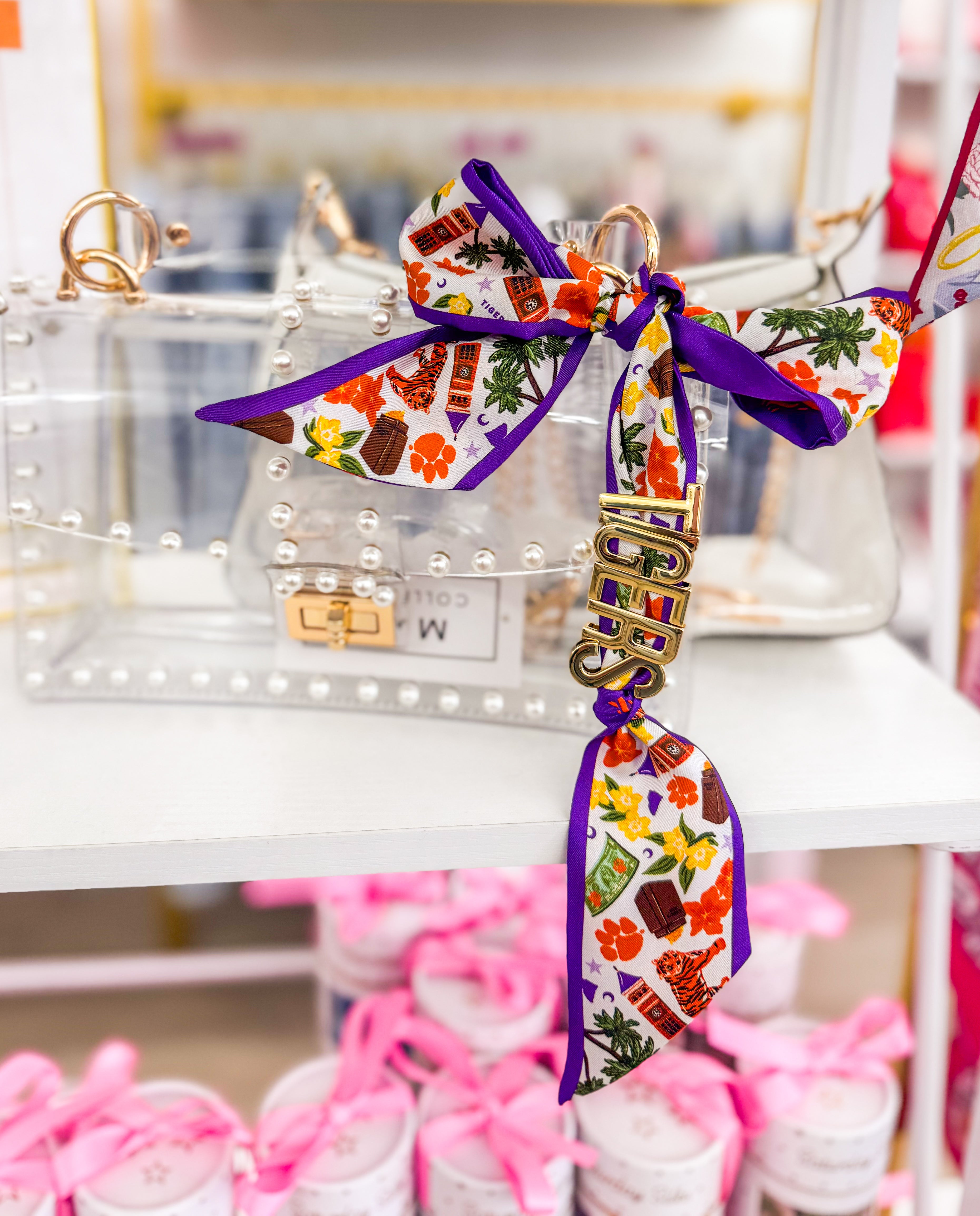 This LSU Twilly Scarf features elegant gold initial sliders spelling out "TIGERS," adding a refined touch of team pride to your outfit. Crafted to be both stylish and versatile, it can be worn in multiple ways—around your neck, as a headband, or wrapped on your handbag—making it a sophisticated accessory for any LSU supporter. The gold accents lend a premium feel, highlighting your dedication with subtle elegance.