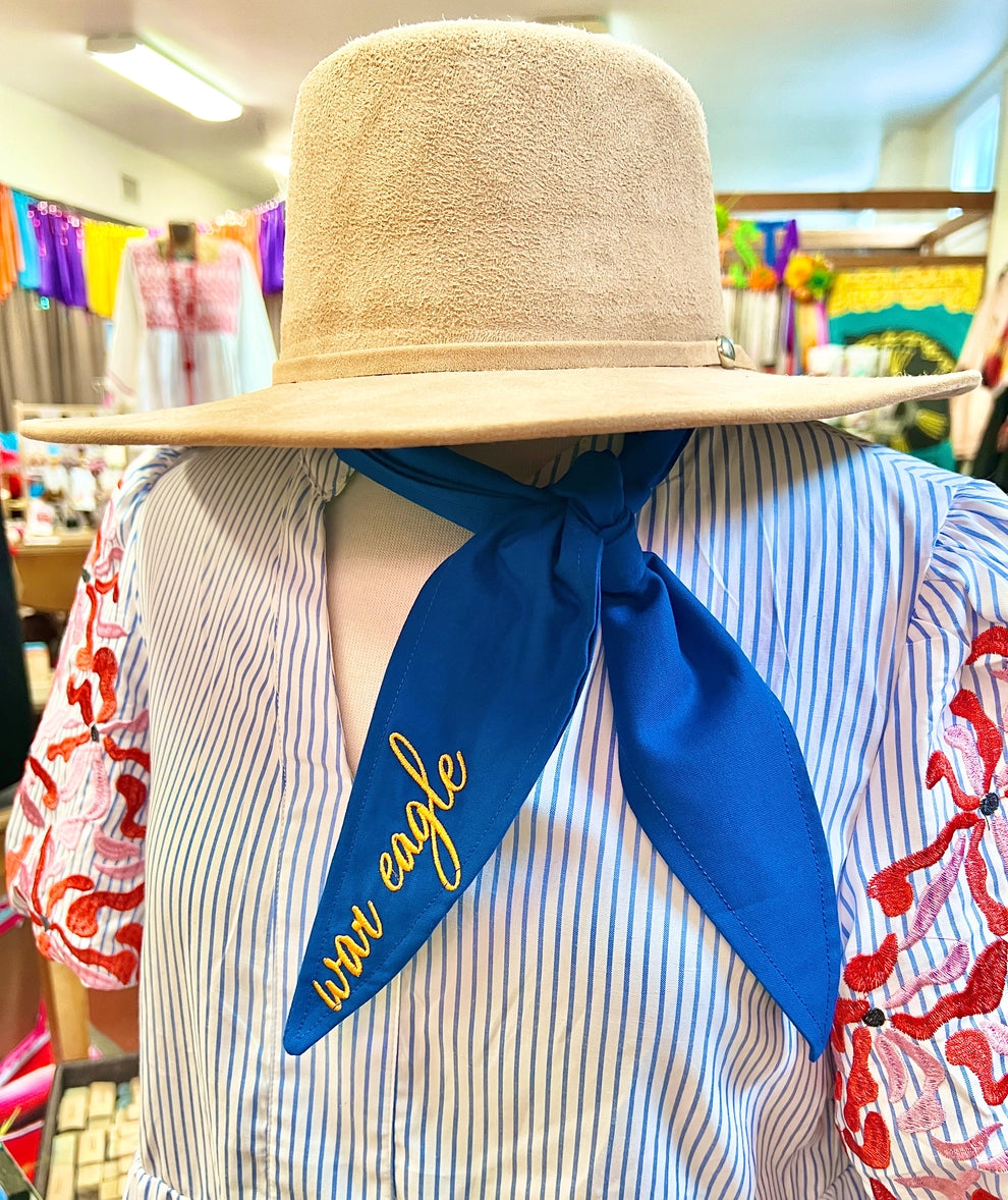 Beautiful Blue Ascot Scarf with Orange Embroidered Text.