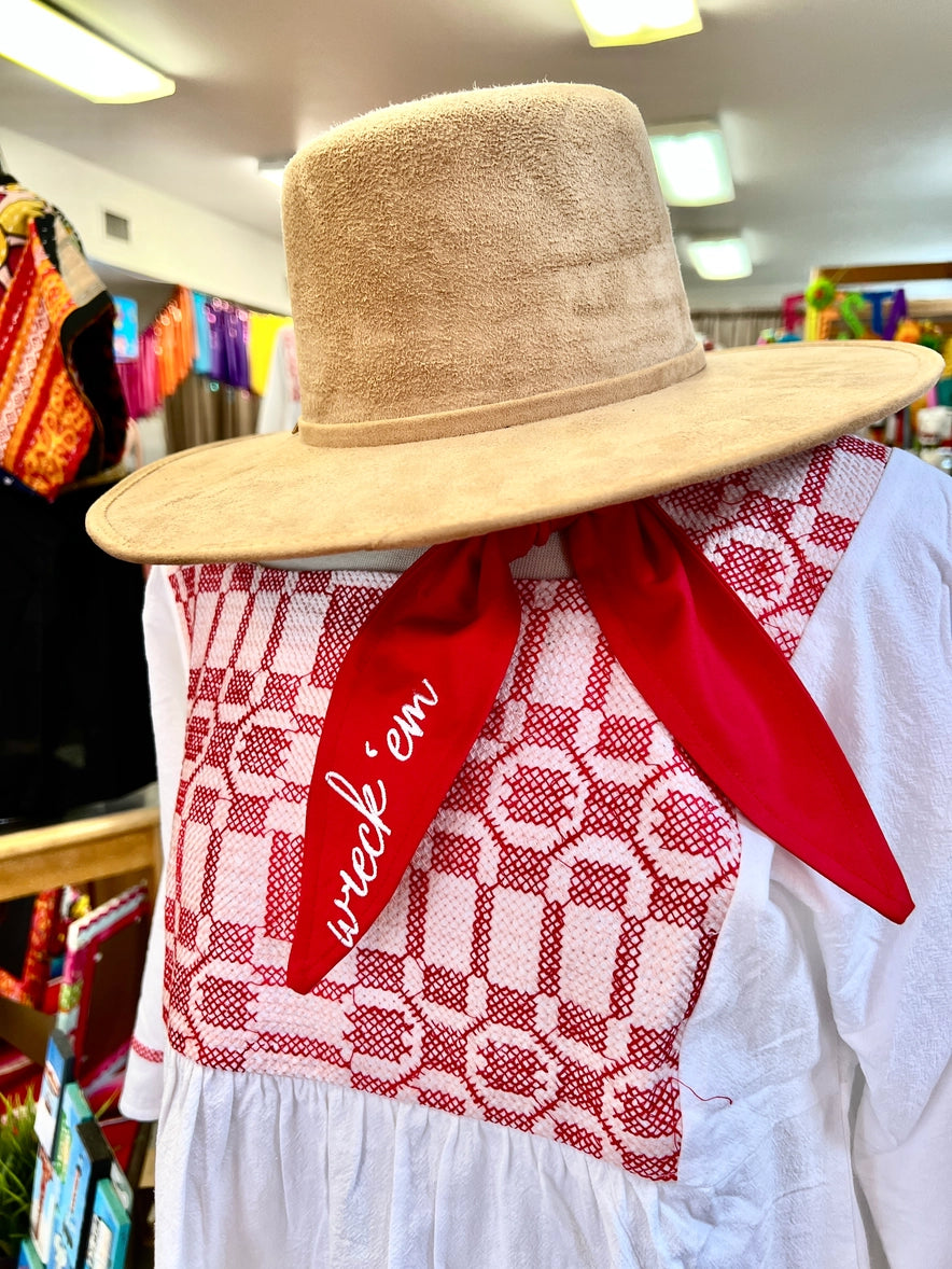 Beautiful Red Ascot Scarf with White Embroidered Text.