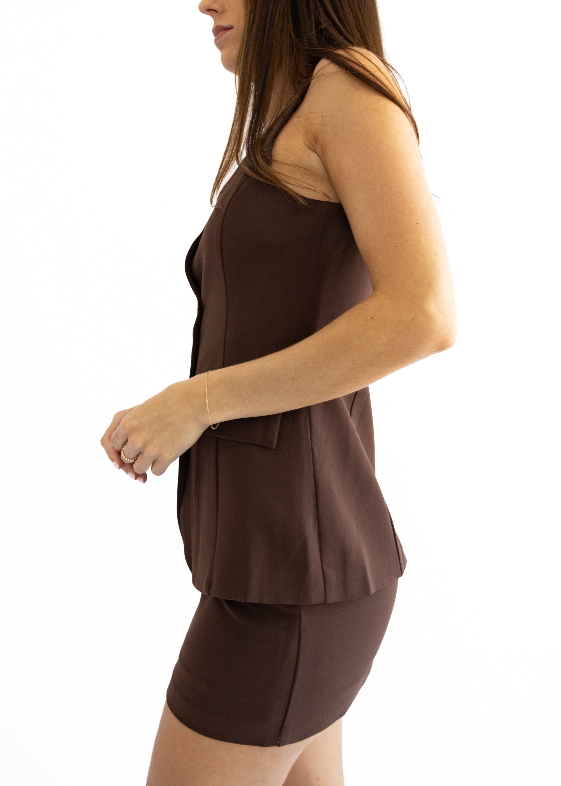 Step out in style with the Espresso Martini Set—a chic brown gold button vest top paired perfectly with a matching mini skirt. This playful duo combines sleek tailoring with a touch of glam, making it perfect for everything from GNO to special events. Elevate your wardrobe with this eye-catching set that’s as fun as it is fashionable!