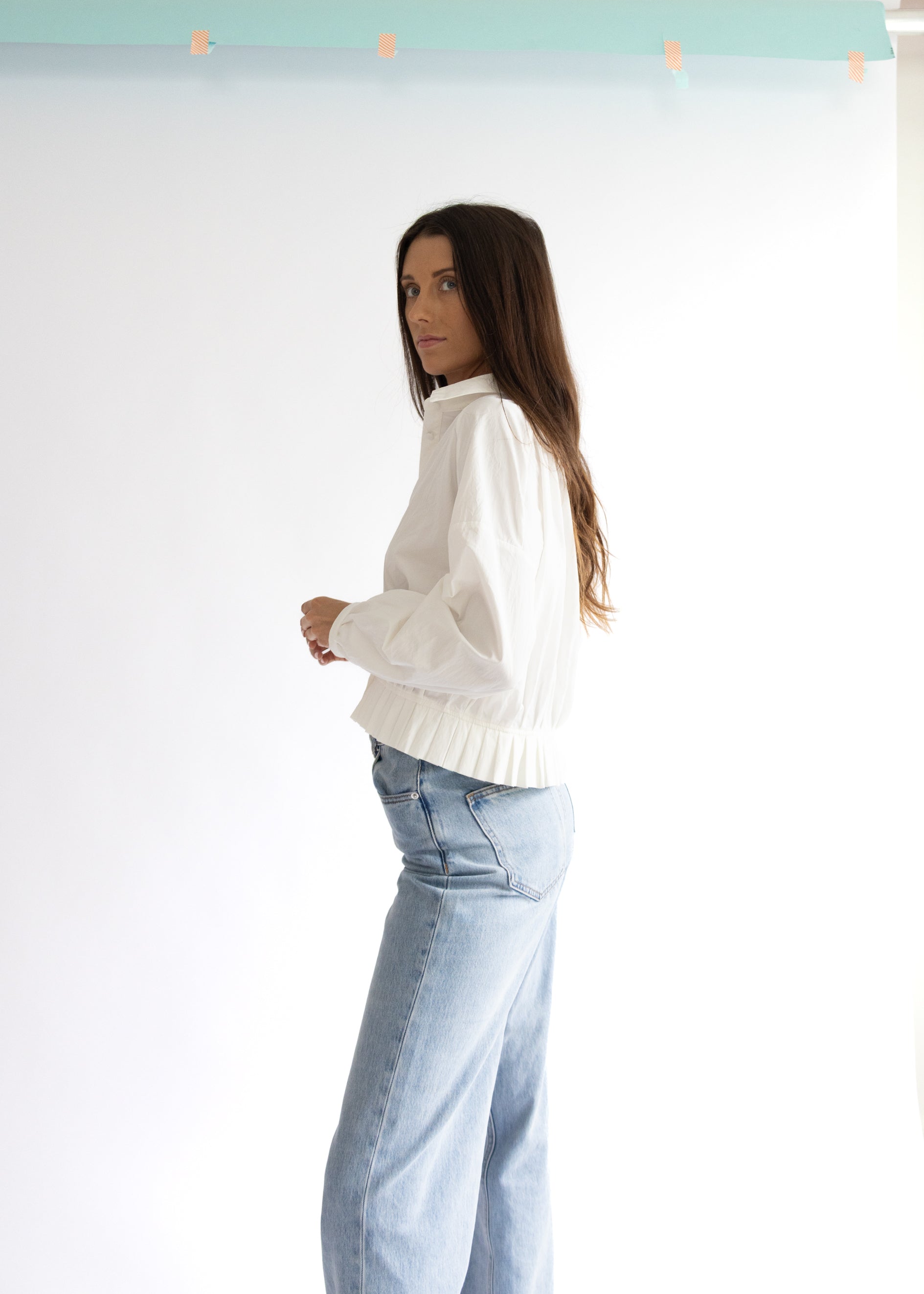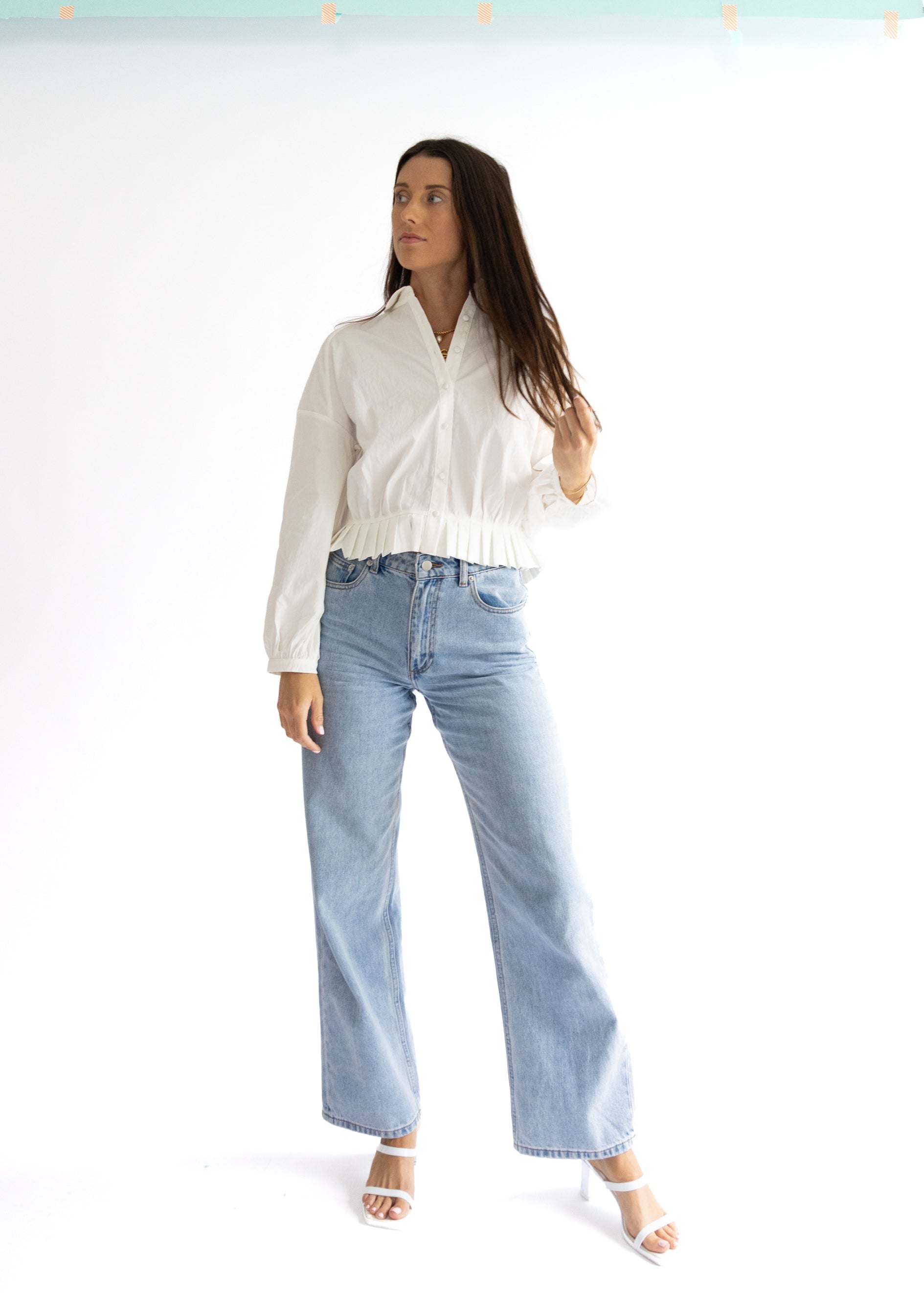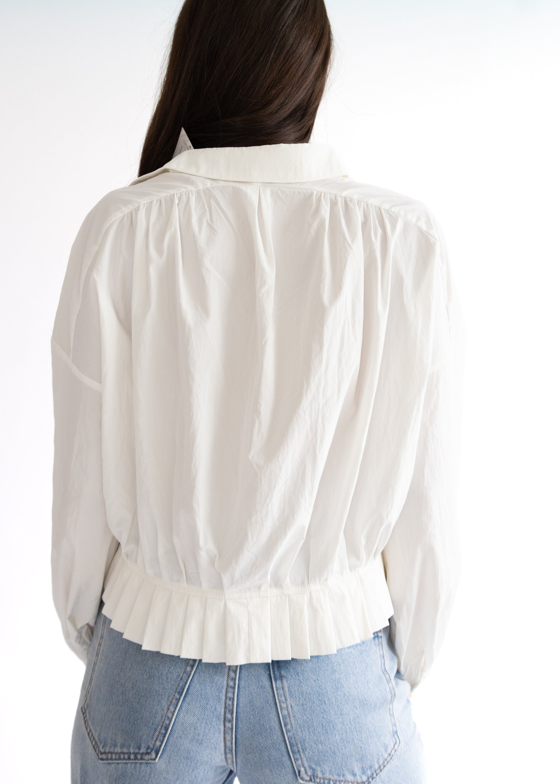 Elevate your wardrobe with the Sutton Ragan Blouse—a crisp white, long-sleeve delight featuring a charming pleated hem and classic button-down front. Perfect for adding a playful twist to your everyday style, this blouse pairs effortlessly with jeans or skirts for a fresh, flirty look.