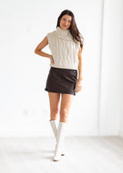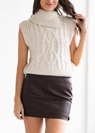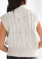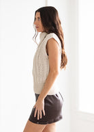 The Kristin Sweater Vest offers a chic twist on classic cable knit. Designed with a sleeveless silhouette and soft ribbed texture, this cozy knit features gold side-neck buttons and a fold-over collar detail for elevated charm. Its slightly cropped fit makes it perfect for pairing with high-waisted denim or tailored skirts for a polished, feminine look.