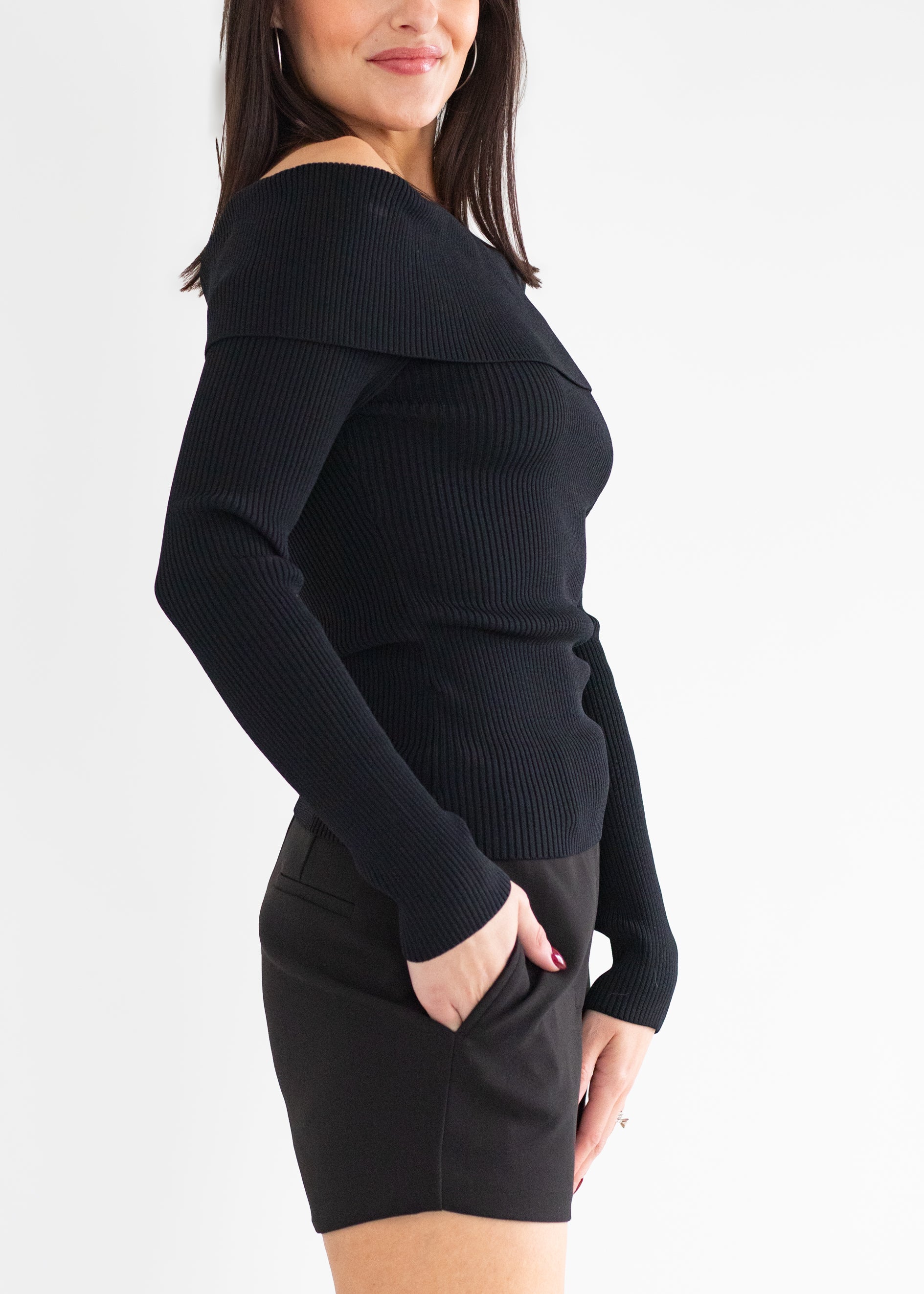 Effortlessly chic, the Lidia Sweater redefines sophistication with its sleek off-the-shoulder neckline and fitted silhouette. Crafted from a soft ribbed knit, this timeless black top hugs the body in all the right places while offering just the right amount of stretch. Perfect for pairing with tailored trousers, sleek skirts, or denim for an elevated yet easy-to-style look.