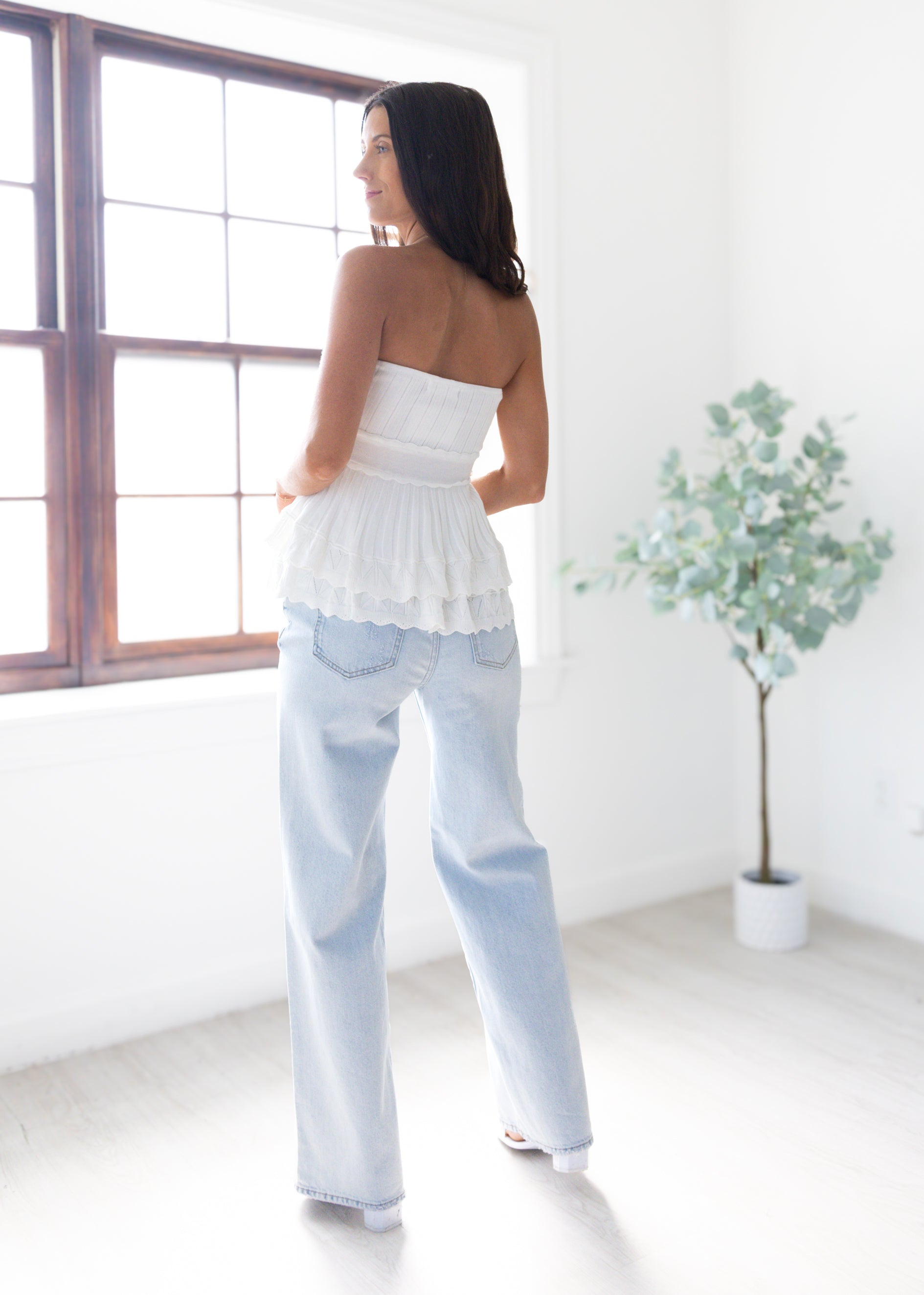This Brenna Strapless Peplum Top brings a playful twist to your wardrobe with its ribbed knit fabric and scalloped trim. The strapless design highlights your shoulders, while the pleated, layered hem adds a flirty, feminine flair. Perfect for sunny days or nights out, this white tube top combines comfort and style effortlessly.