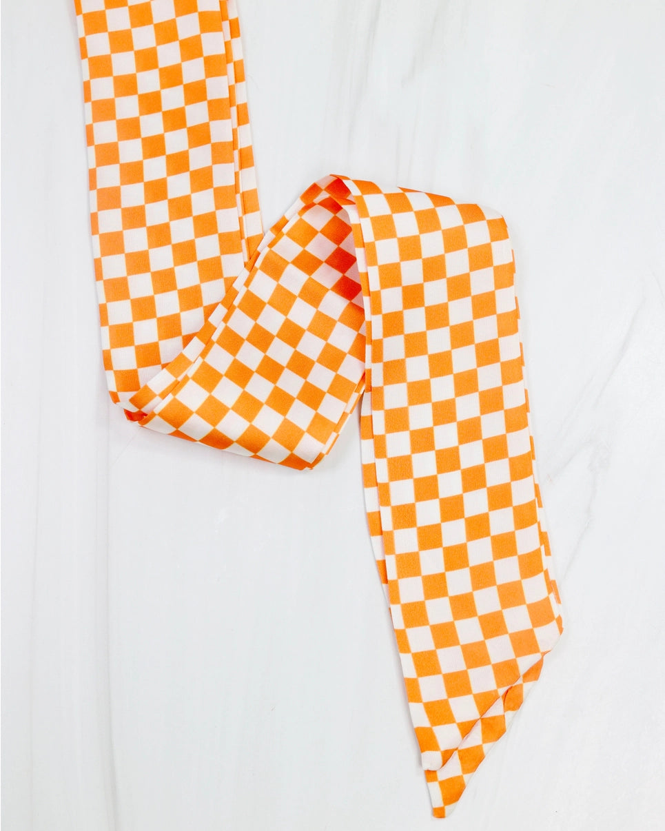 Add a stylish touch to any outfit with the Dahlia Scarf in a fun orange and white checkered print. Its smooth satin-like texture makes it perfect for tying around your neck, wrist, bag, or even your cowgirl boots, adding a playful and fashionable flair wherever you wear it.