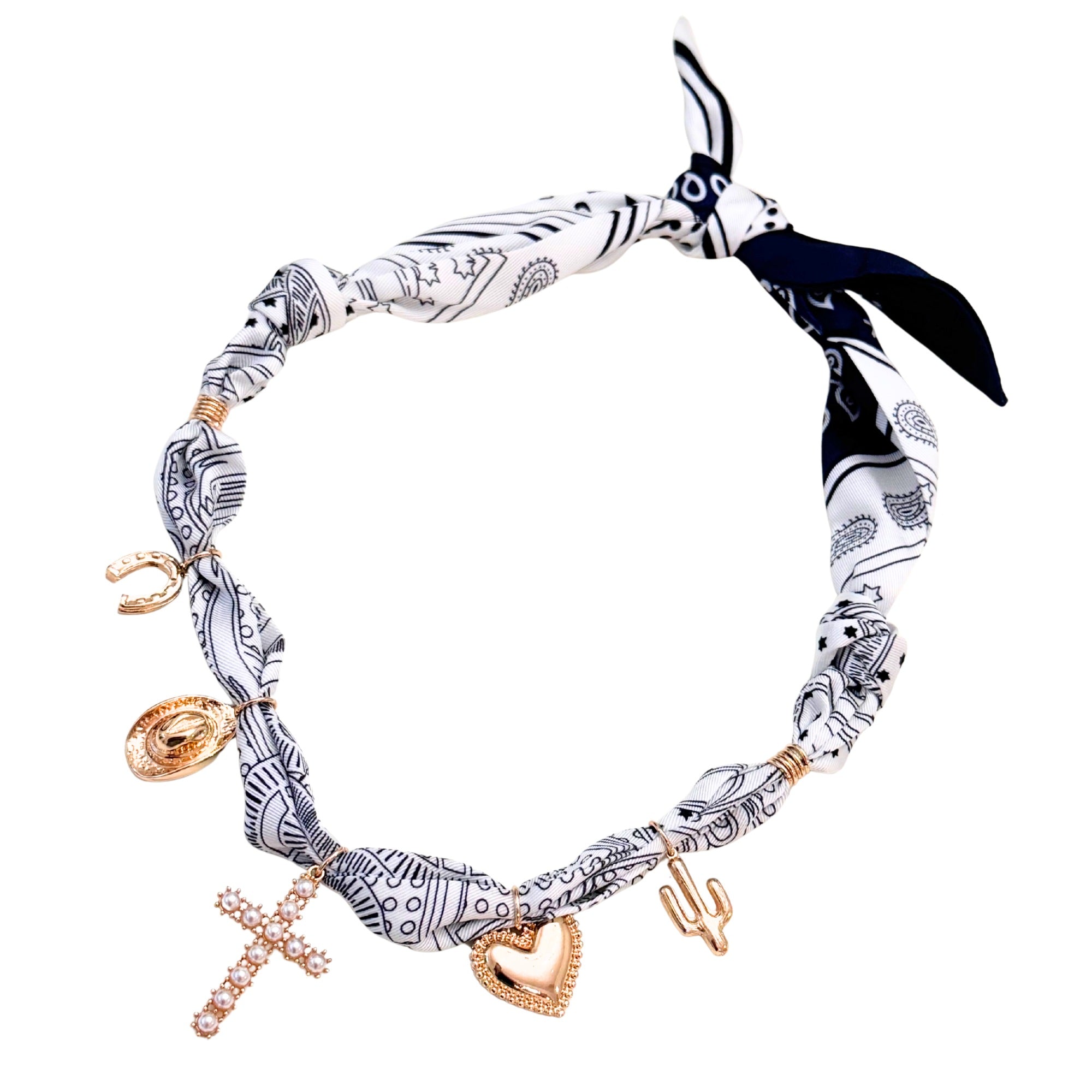 Finished with five fixed charms—a cactus, heart, cowboy hat, cross, and horseshoe—it adds a playful, western-inspired edge to your look. Ideal for gameday, concerts, or everyday wear, this scarf necklace is versatile, chic, and full of personality.