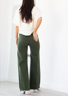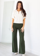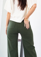 A signature silhouette, Penny features a high rise and ultra-wide leg with a full-length 28" inseam that creates clean, fluid movement. Designed without side seams for a smooth, uninterrupted line that elongates the frame. Crafted from comfort stretch denim that holds its structure while allowing ease of wear. Laurel, a deep green tone, grounds the look with understated sophistication.