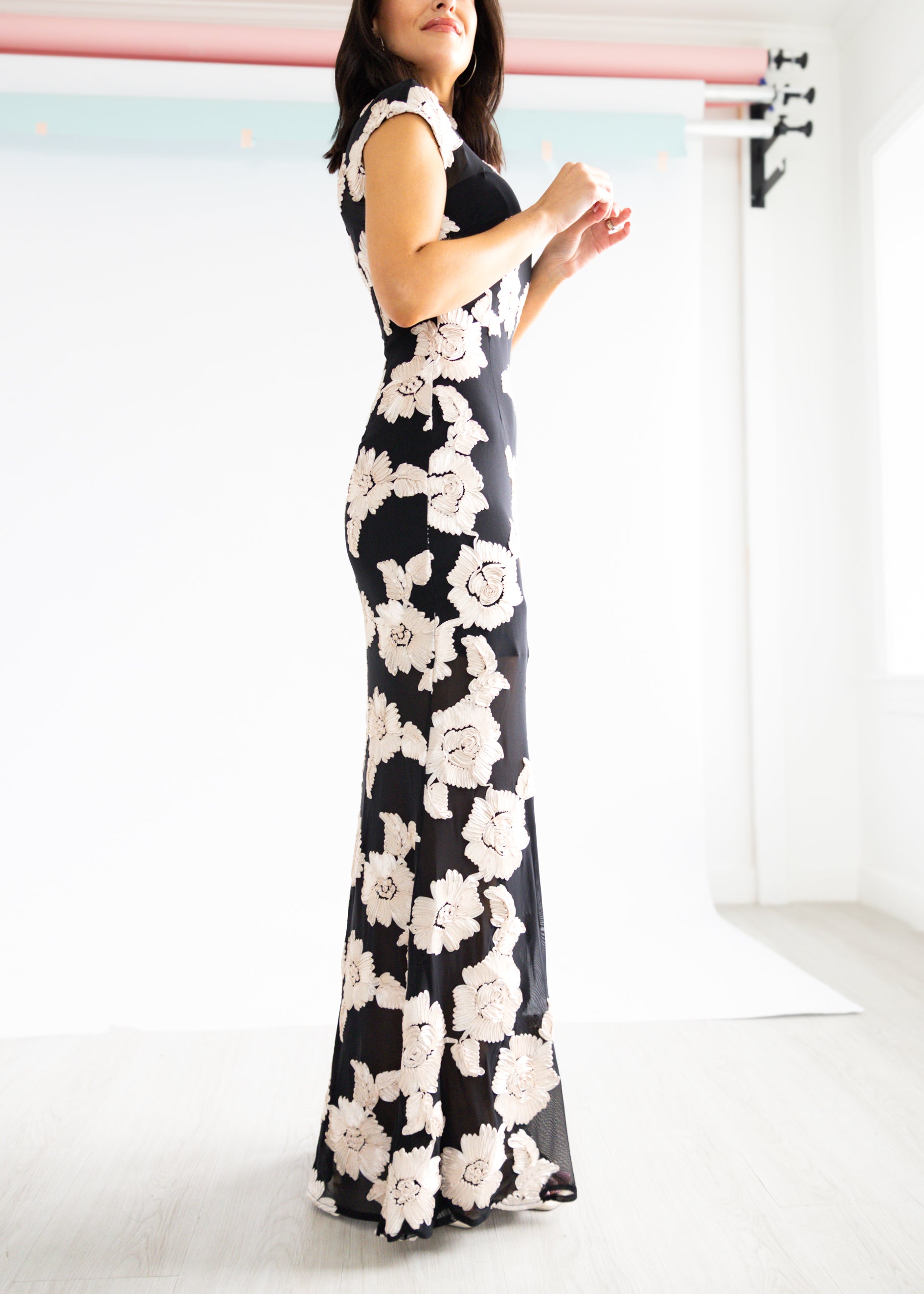 Featuring a structured boat neckline and extended shoulder design, the gown frames the upper body beautifully, offering a sleek and timeless silhouette. The fit and flare shape hugs the torso before flowing into a full-length skirt, creating graceful movement with every step. Gold floral embellishments glisten against the black base, adding dimension and a touch of drama.