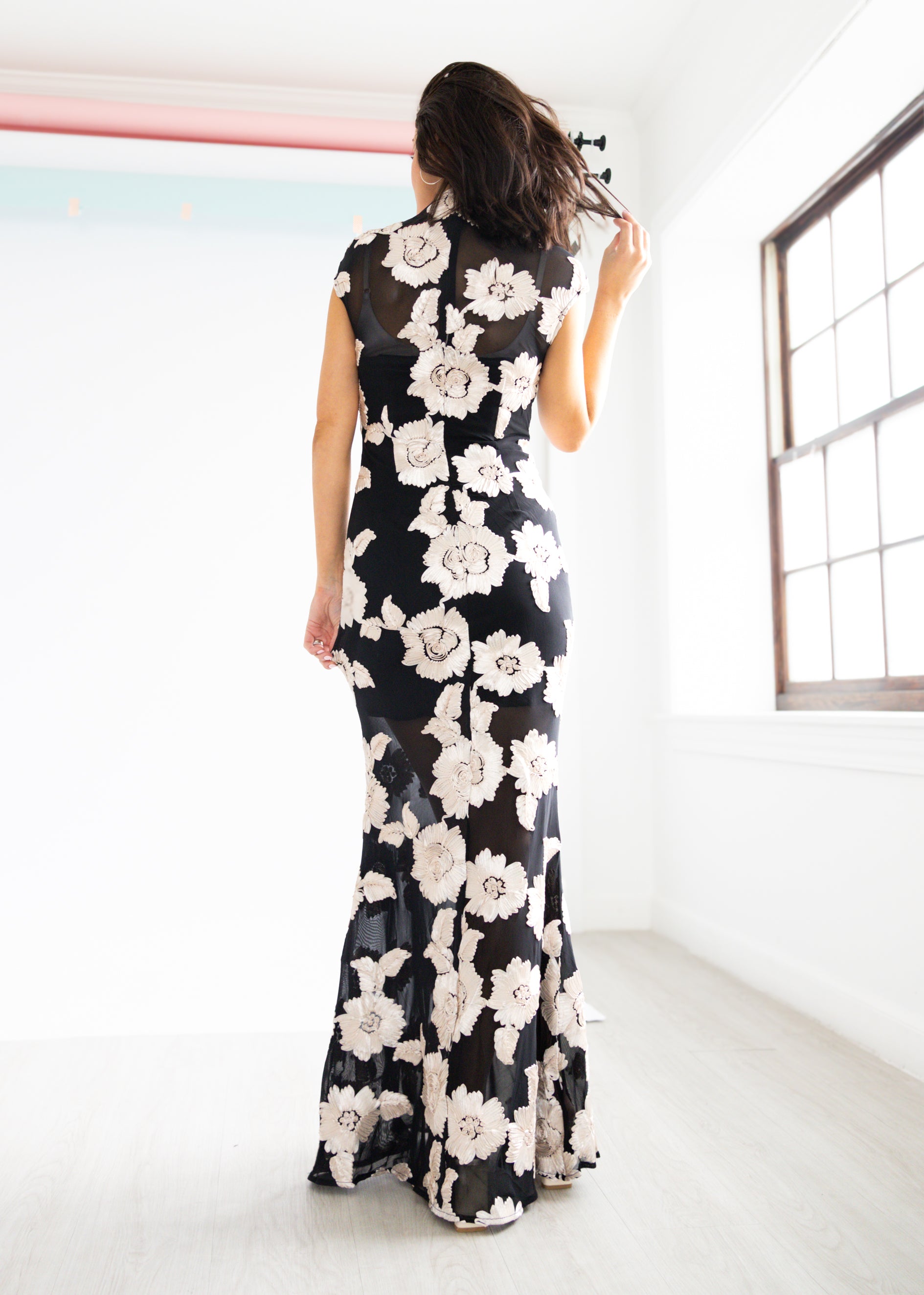 Bring opulence to your evening wardrobe with the Margaux Fit & Flare Gown in Black & Gold Floral. Designed for formal occasions and statement moments, this floral embellished mesh fitted gown balances elegance with striking detail.