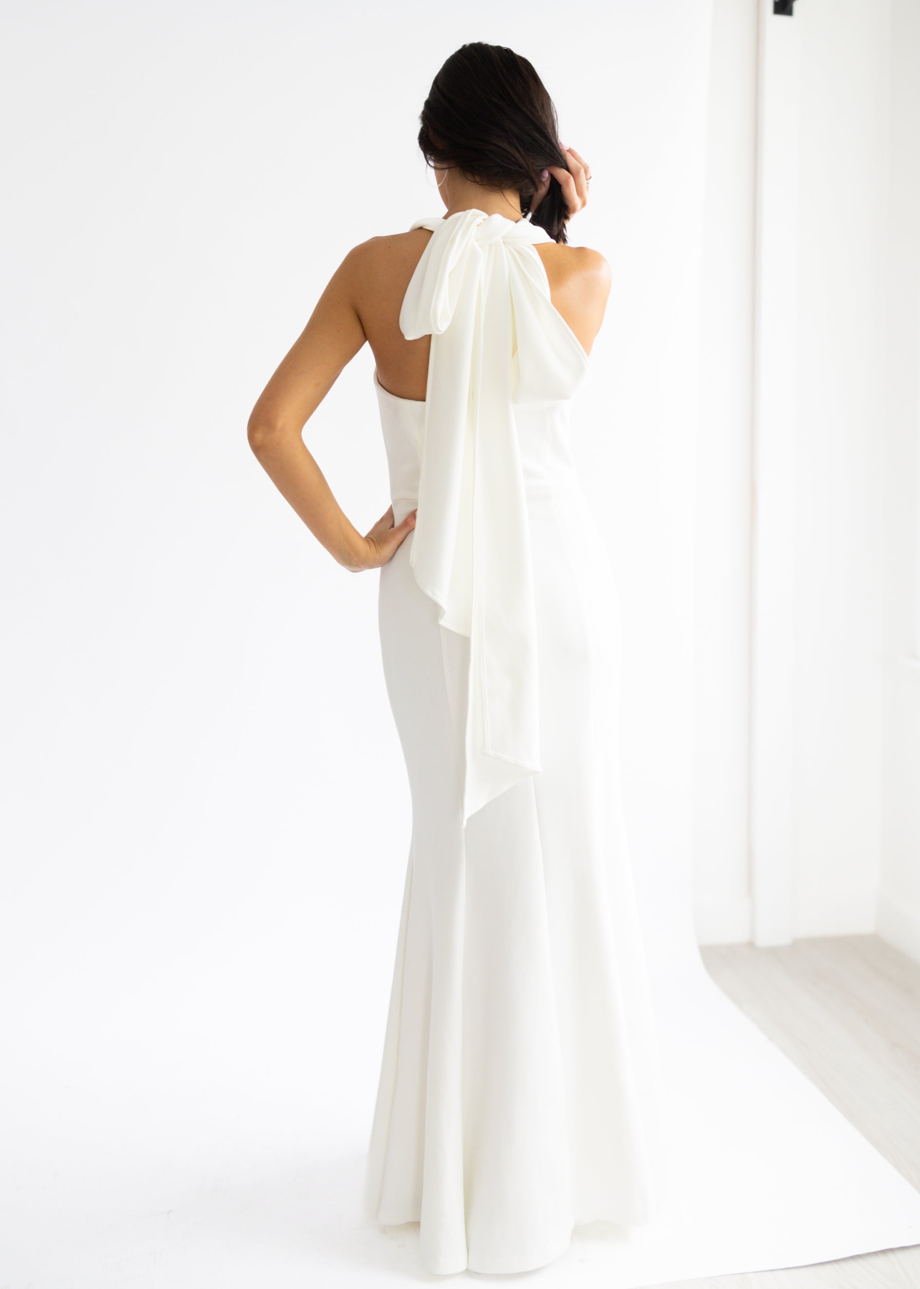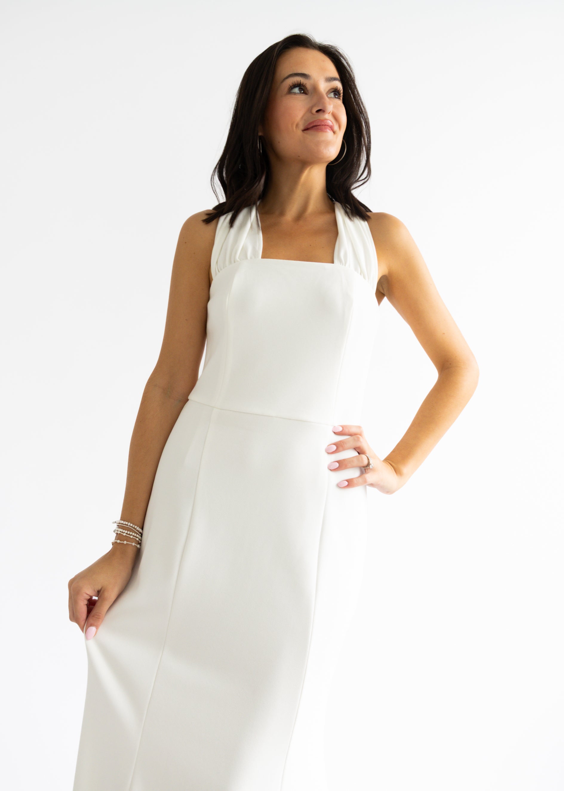 Sleek and sophisticated, the Mira Halter Gown in White is the definition of modern elegance. This sash halter gown features a soft sash detail with delicate gathers on the neckline, offering graceful texture and a romantic touch to its minimalist silhouette.