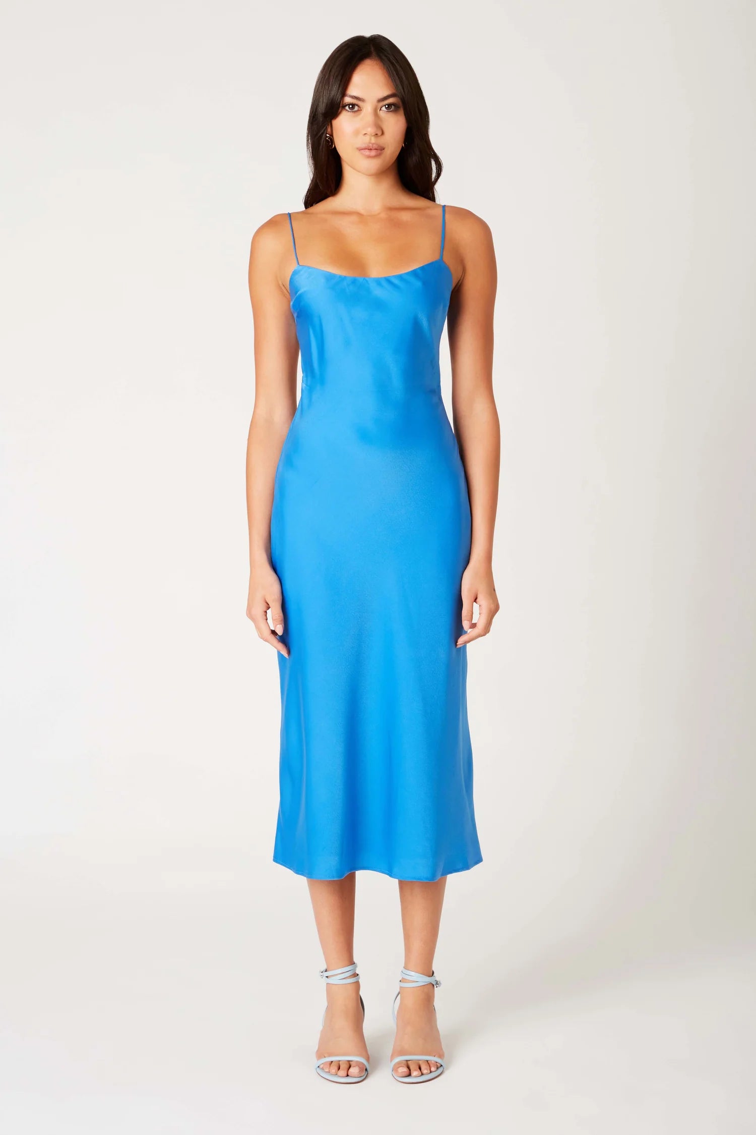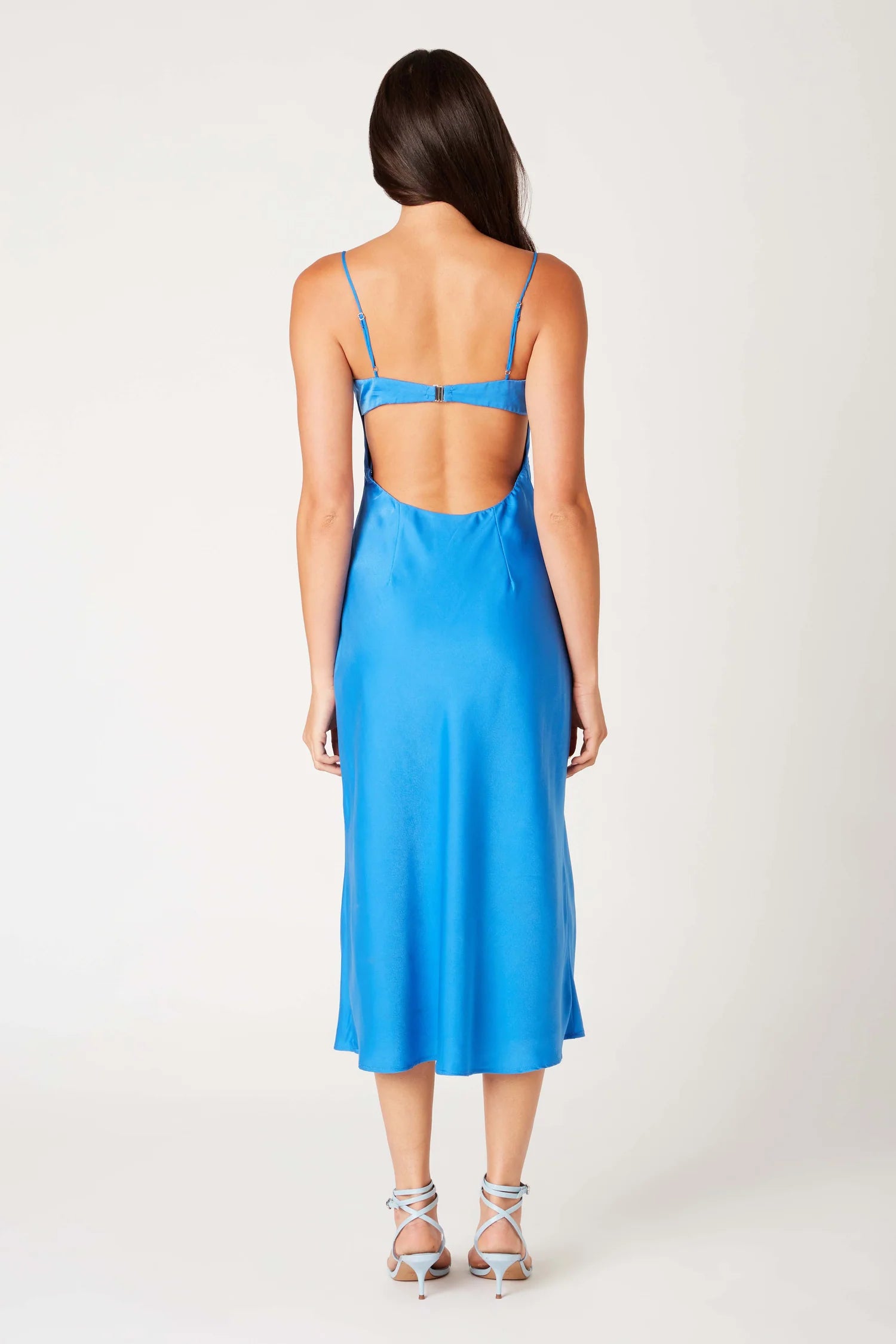 Satin midi bias dress featuring spaghetti straps and open back detail. Fully lined.
