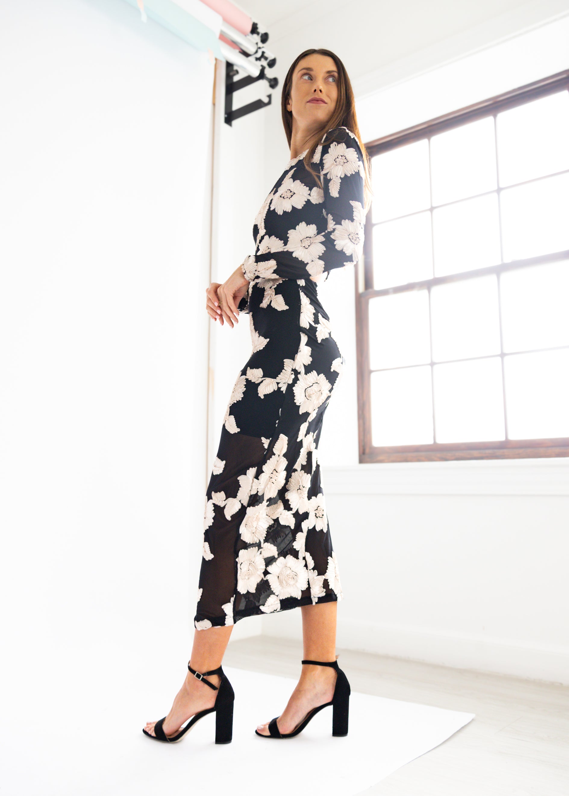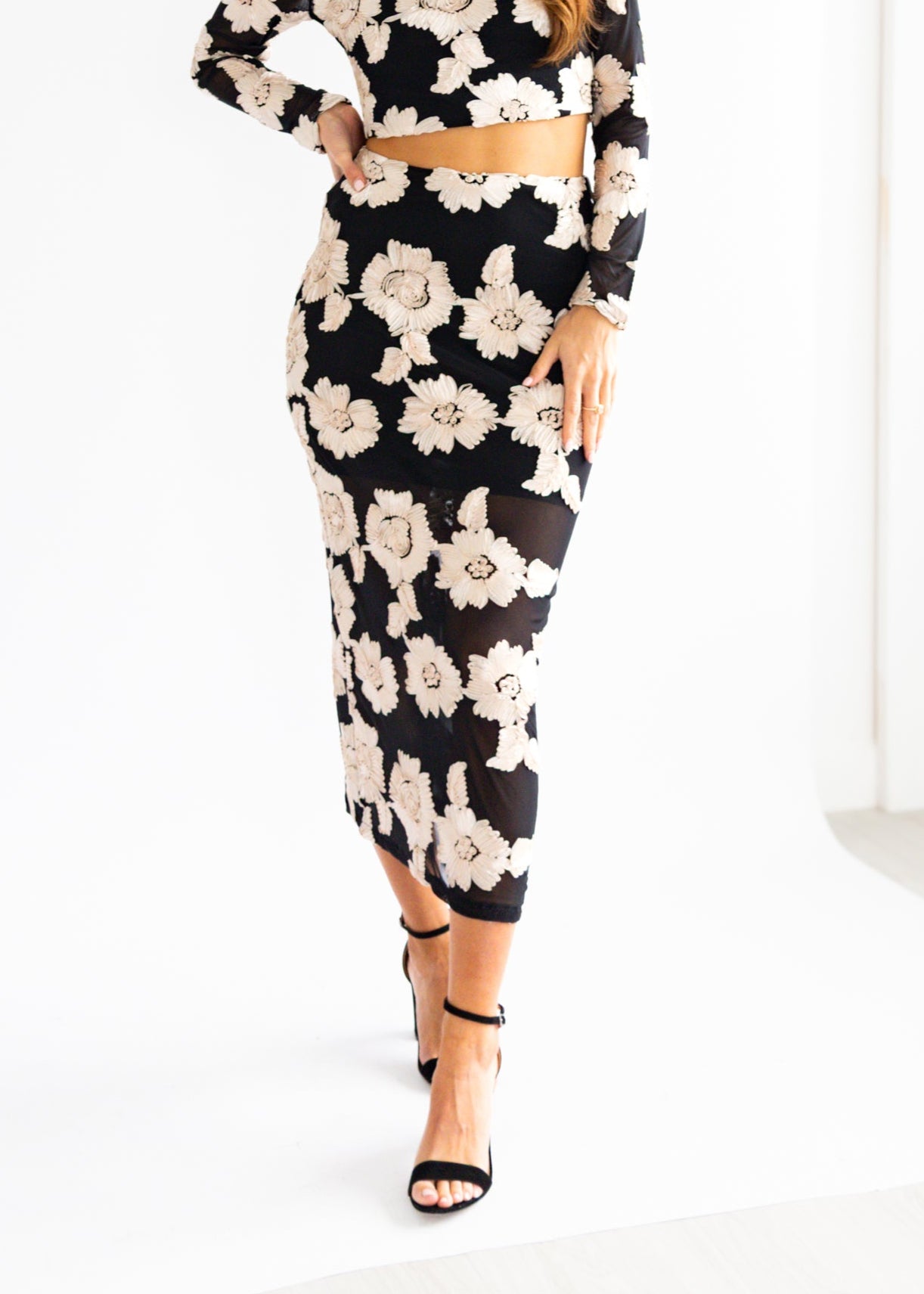 Complete your look with this fitted column skirt, designed to perfectly match the Margaux Top. Featuring elegant floral embroidery, a sleek silhouette, and a subtle back split for easy movement, this skirt offers a refined yet modern edge. The invisible back zipper ensures a seamless fit, making it the ideal pairing piece for the Margaux Top or a versatile statement on its own—perfect for weddings, cocktail parties, and chic evenings out.
