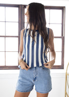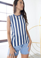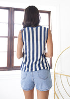 Stay cool and stylish in the Boardwalk Sweater Tank, featuring playful navy and white stripes. This lightweight sweater tank is perfect for sunny days or layering on breezy evenings, combining comfort with a fun, nautical vibe.