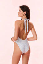 Introducing the Meegan Swimsuit. This flirty one-piece debuts with a printed toile with embroidery details. The swimsuit has a self-tie detail around the beck, embroidery stitching around the neck and arm holes, coverage at the back, and a sexy, plunging neckline.