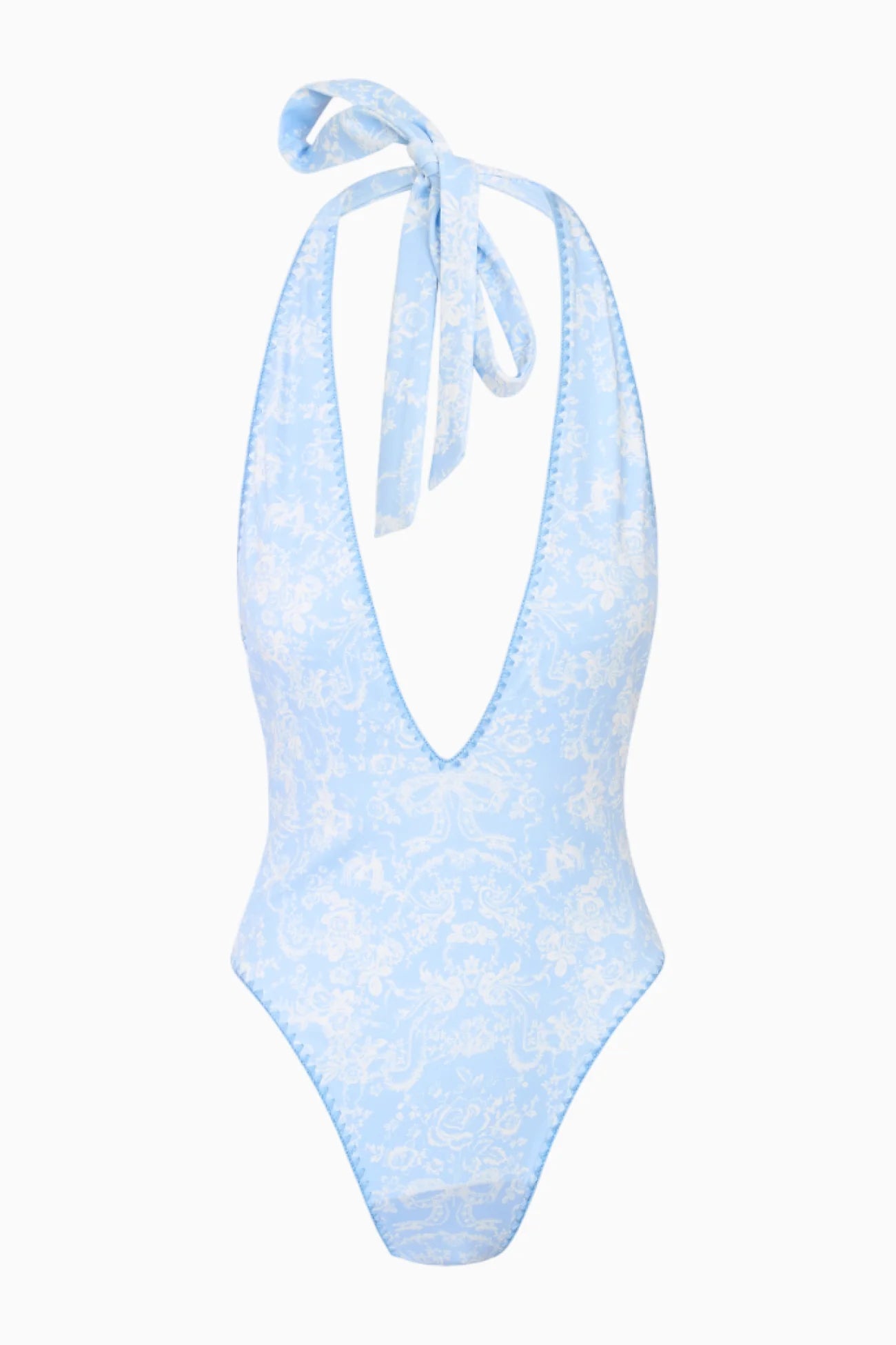 LoveShackFancy Meegan Toile Print One Piece Swimsuit - Blue Cove