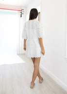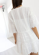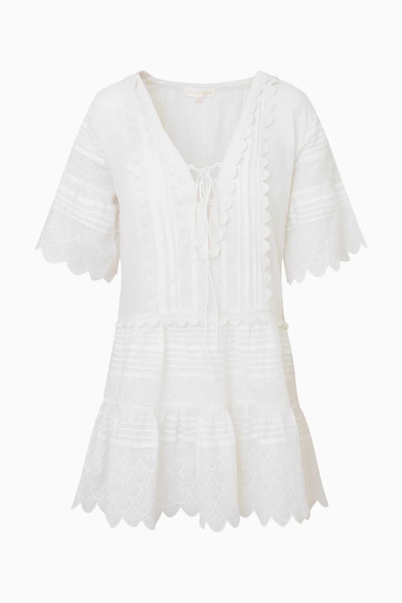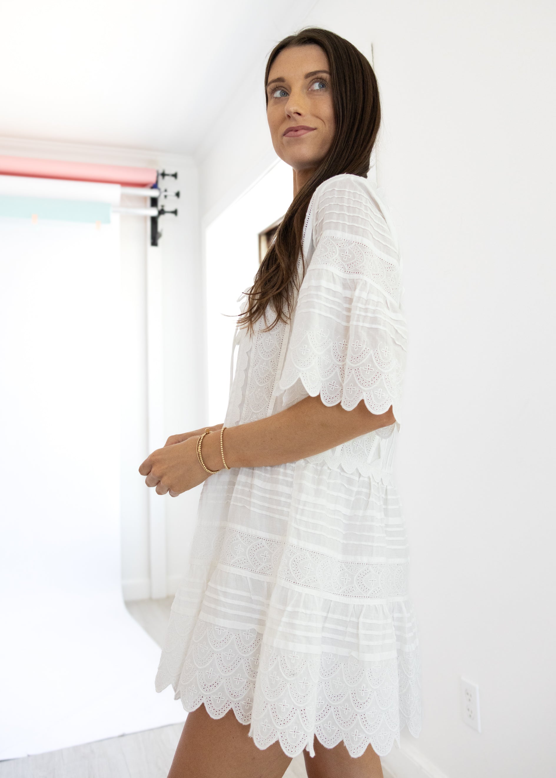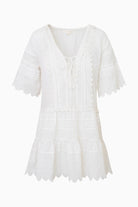 Introducing the Orica Dress. This charming mini debuts with a summertime cotton fabric ideal for warm weather and vacation wear, adorned with gorgeous scallop embroidery and vintage-inspired lace details. Beginning with a v-neckline, the A-line dress has lace adorning the center front that falls to an easy body with a flattering drop waist silhouette. The piece features charming bell sleeves and a tie detail at the center front with tassels. Remove the slip and style as a beach cover up.