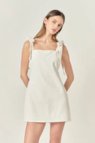 This white Olivia Denim Mini Dress features playful shoulder ties that add a flirty touch to its classic silhouette. Perfectly blending timeless style with a trendy twist, it’s your go-to for sunny days and casual outings. Easy to dress up or down, this mini dress keeps your look fresh and fun all season long.