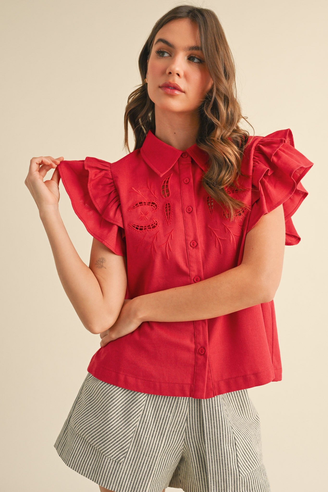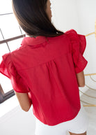Add a pop of playful charm to your wardrobe with this cherry red embroidered button-down top. Featuring delicate eyelet details and flutter sleeves, it combines flirty femininity with a vibrant splash of color. Perfect for brightening up any outfit, this top brings a fun, fresh vibe to your everyday style!