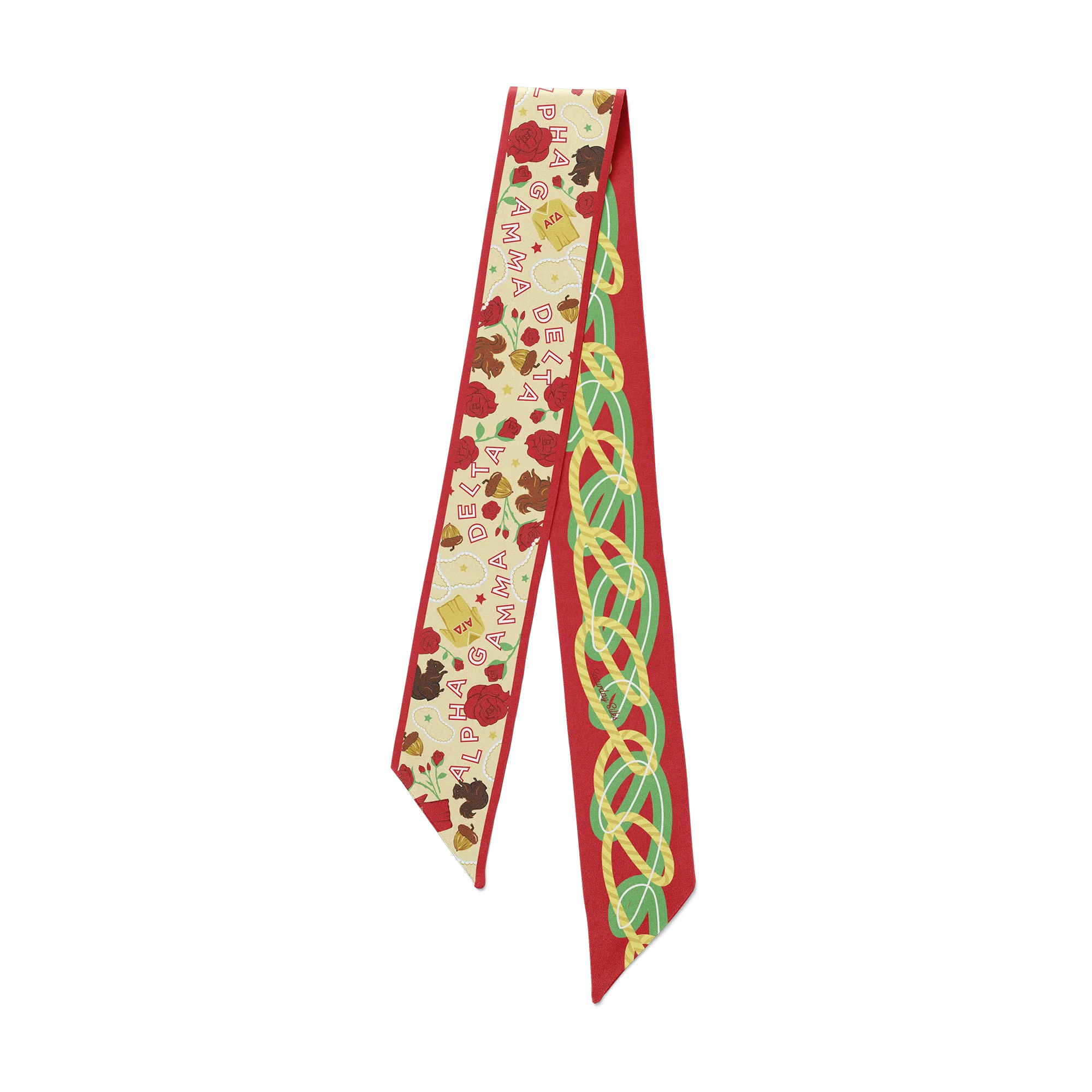 This versatile Alpha Gamma Delta Twilly Scarf offers multiple styling options for showing your sorority pride. Perfect to wear in your hair, around your wrist, or wrapped around a purse strap, it's a beautiful accessory that adds a touch of elegance to any outfit while representing your sisterhood.