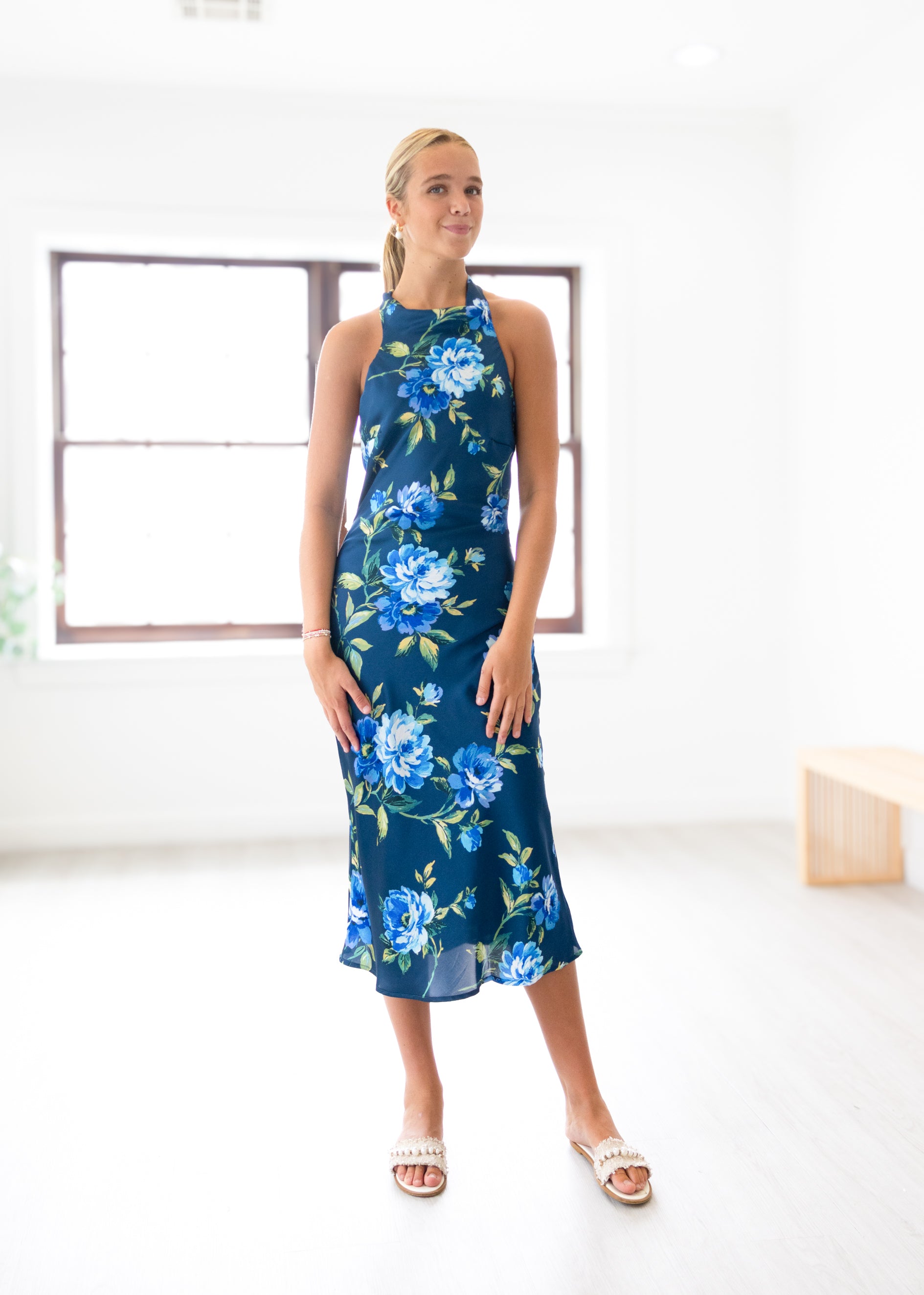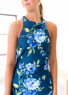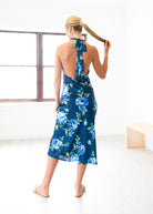 Step into summer with the Cobalt Garden Maxi Dress, a playful blend of elegance and ease. This satin halter maxi features a low back and a stunning insignia blue base adorned with vibrant floral prints, perfect for turning heads at any event. Its flowing silhouette offers comfort while making a bold style statement.