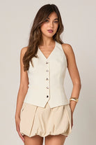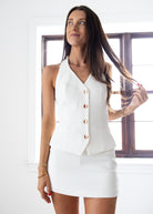 The Brielle Halter Button Up in cream brings a playful twist to your everyday look. With its flirty halter neckline and easy button-up style, this top is perfect for sunny days! Lightweight and breezy, it keeps you cool while adding a dash of charm to any outfit. Get ready to turn heads and have fun with your fashion! Pair it with our Brielle Mini Skort for the cutest, chicest set!
