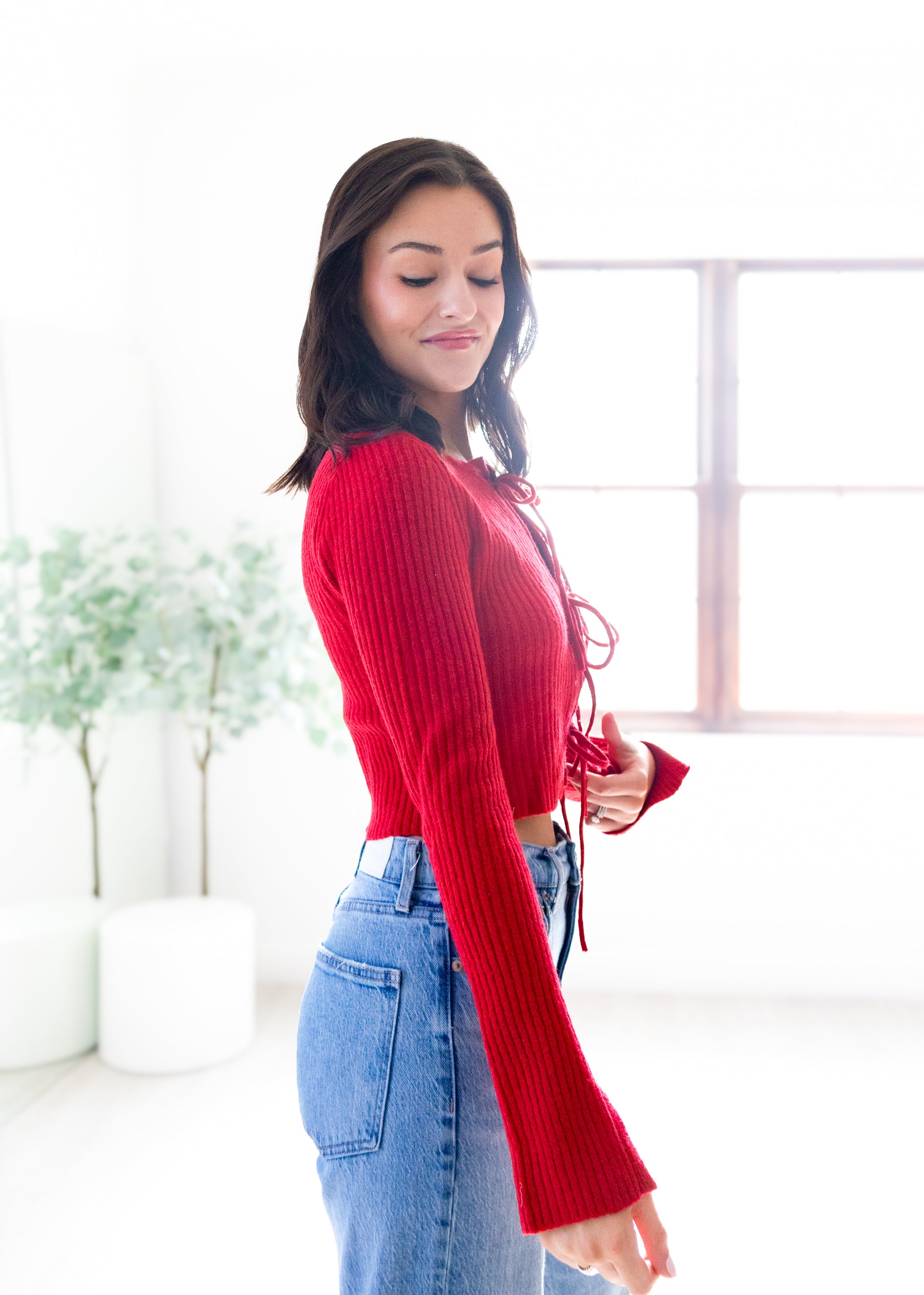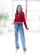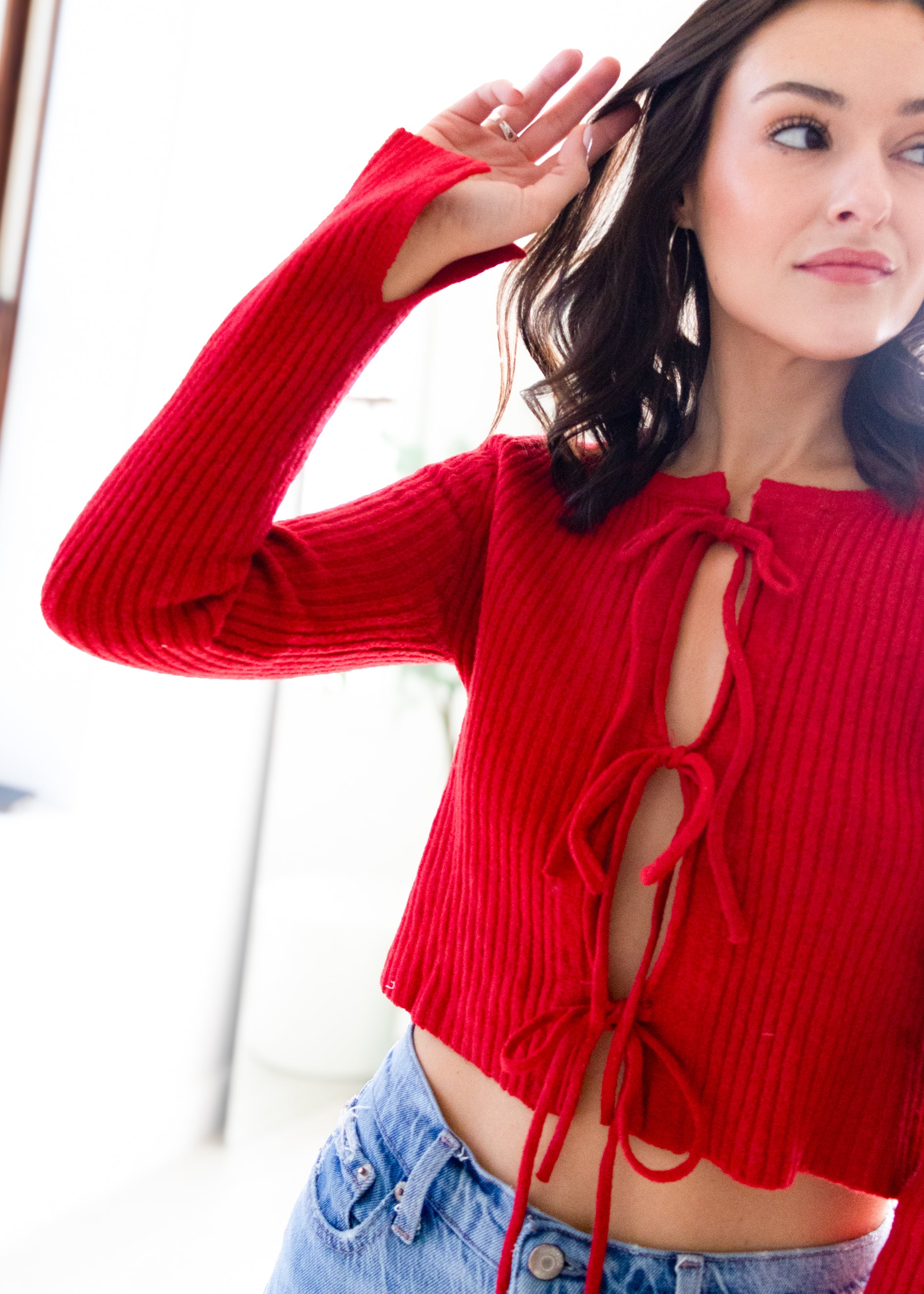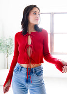 This playful cropped sweater features charming front bow ties that add a flirty touch to your look. Perfect for layering or wearing on its own, it brings a fun and feminine vibe to any outfit. Cozy yet stylish, it’s your new go-to for casual days with a twist.