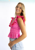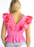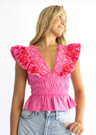 Elevate your style with the Think Pink Embroidered Ruffle Top, featuring delicate pink floral embroidery that adds a touch of feminine charm. Its soft pink hue and graceful ruffle details create a flattering silhouette perfect for any occasion. This top effortlessly combines elegance and comfort, making it a must-have addition to your wardrobe.