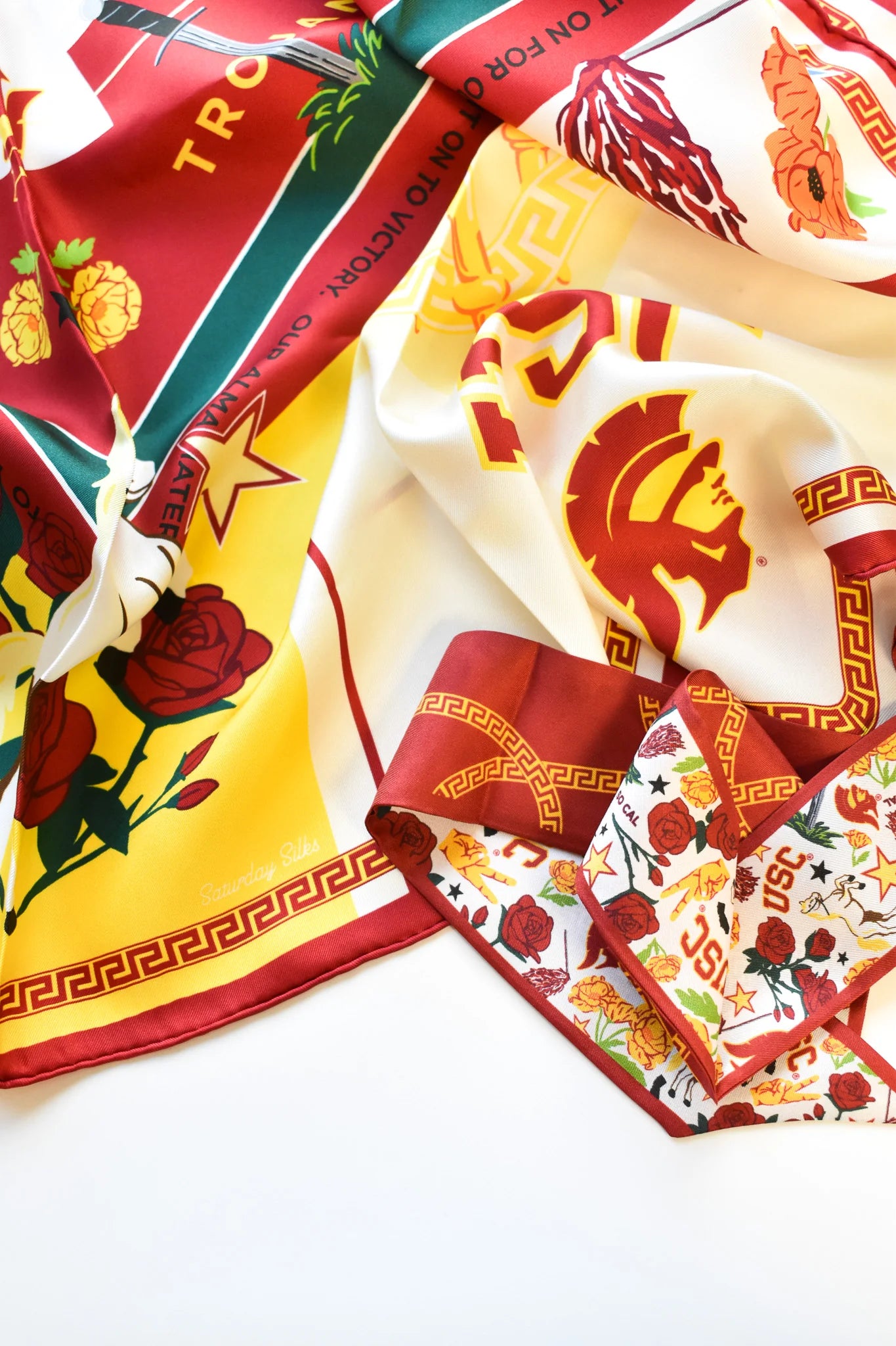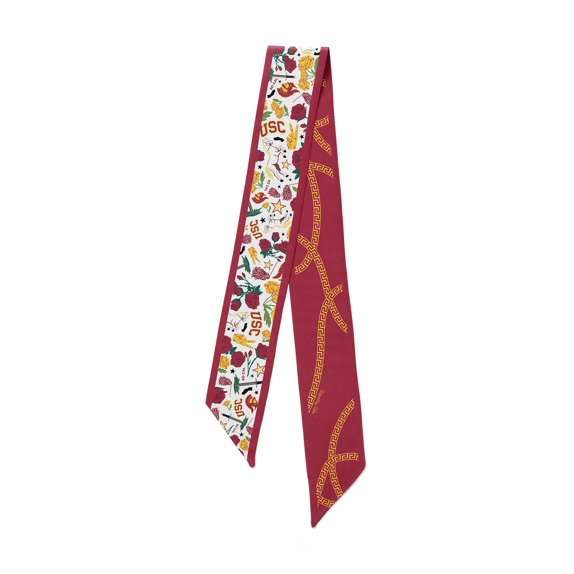 Show off your Trojan pride with the USC Trojans Twilly Scarf! Made from 100% silk, this scarf features our unique Trojan floral print on one side and our Greek Key twist print on the other. Use it to add a touch of style to your hair, wrist, or purse. It's the perfect accessory for any USC fan. Officially licensed by the University of Southern California.