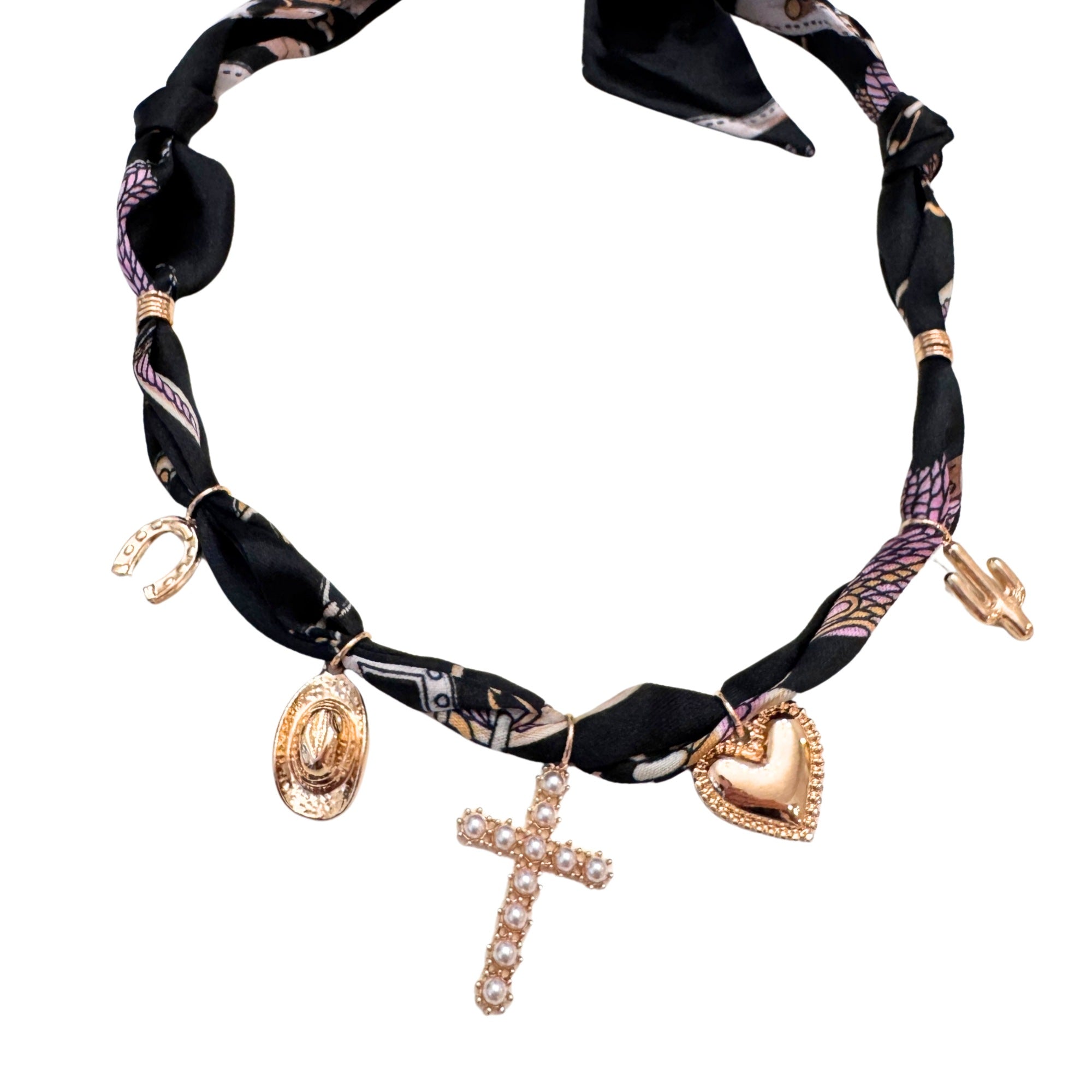 Make this scarf necklace with charms your go-to statement piece for effortless style and a touch of western glam.