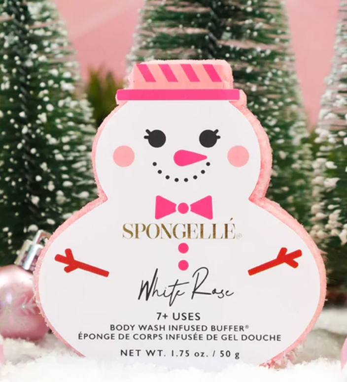 Pink snowman Spongellé body buffer for a cozy, winter-fresh shower routine