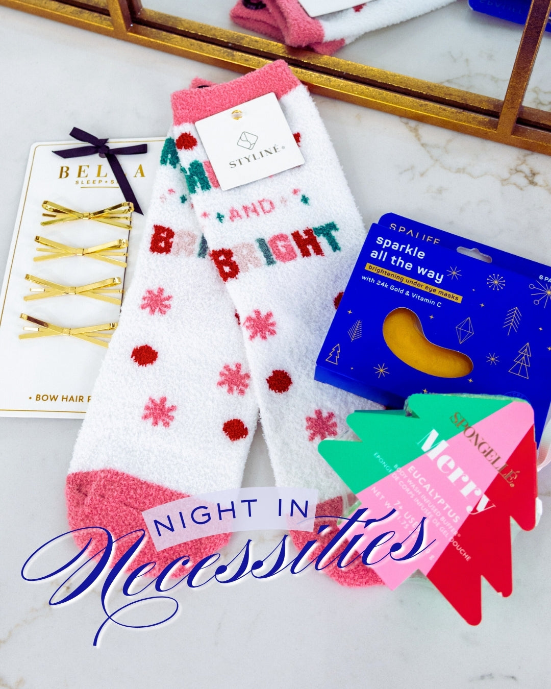 Get ready for the ultimate cozy night at home with our Night-In Necessities Bundle. This curated set includes everything you need to unwind and feel pampered—soft and festive fuzzy socks to keep your toes warm, brightening under-eye masks for a little self-care glow, chic gold bow hair pins for effortless lounging style, and a holiday-scented Spongellé buffer to turn your shower into a mini spa moment. It’s the perfect mix of comfort, relaxation, and a touch of sparkle—made for gifting or treating yourself to the sweetest night in. ✨🧦💛