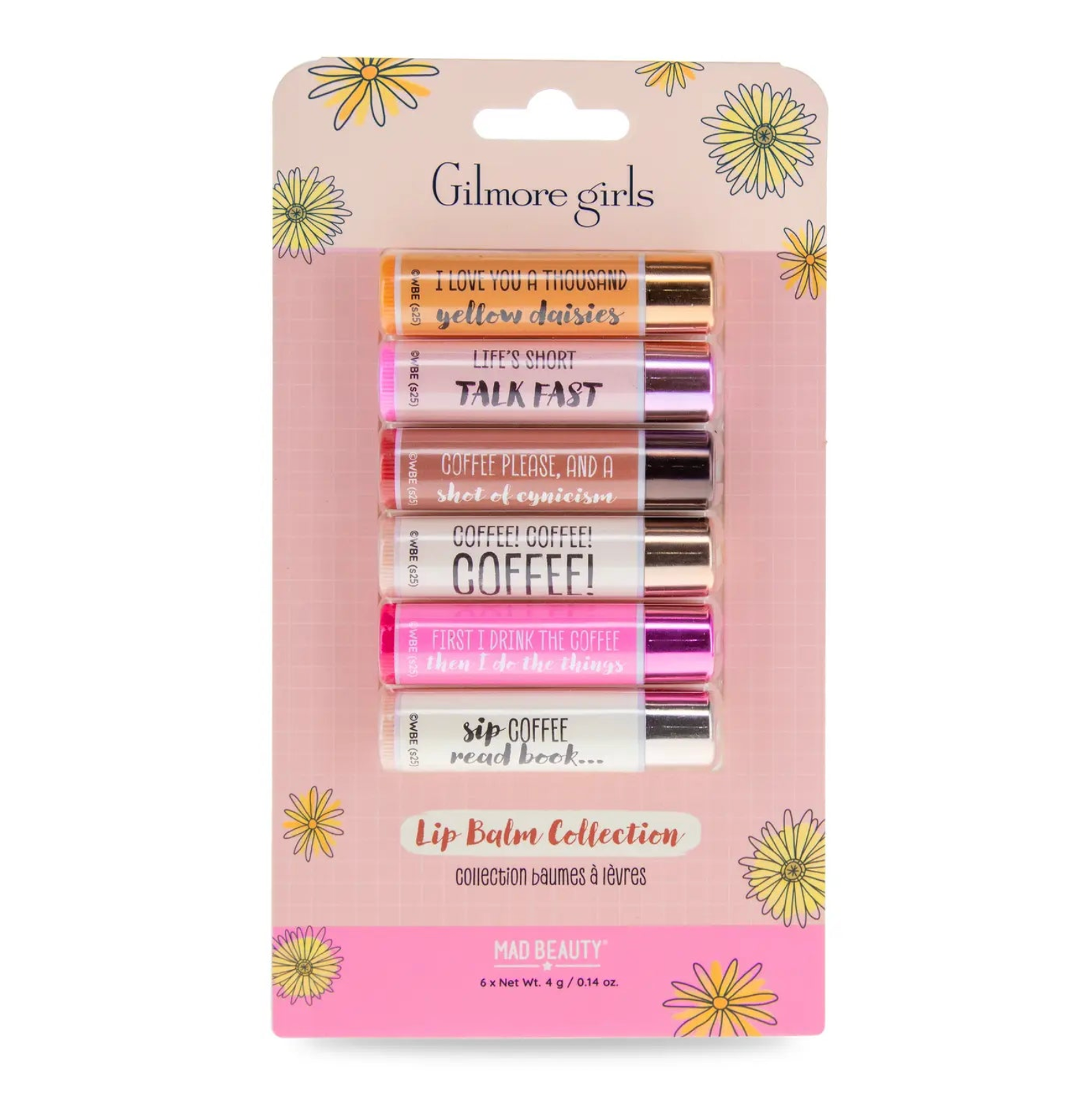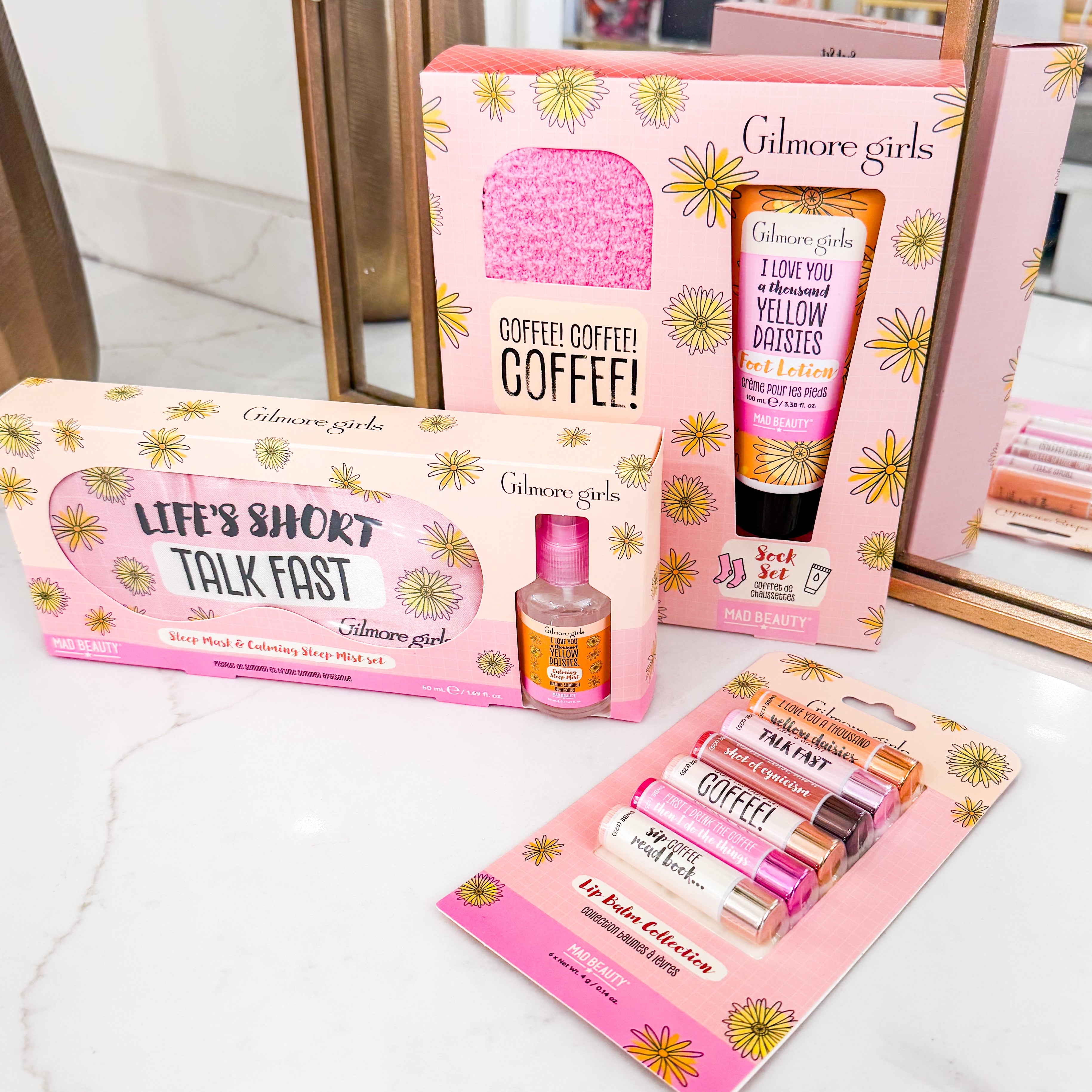 Snuggle up Stars Hollow–style with this dreamy trio: a fuzzy sock + foot cream set, a relaxing sleep mask + mist duo, and a set of 6 Gilmore-themed chapsticks.