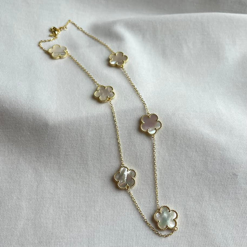 Delicate and dazzling, the Adeline Clover Necklace features luminous Mother of Pearl set in an elegant clover design. Its iridescent finish catches the light beautifully, creating a look that’s both timeless and versatile. Perfect for layering or wearing solo, this necklace effortlessly transitions from day to night, adding a touch of refined charm to every outfit.